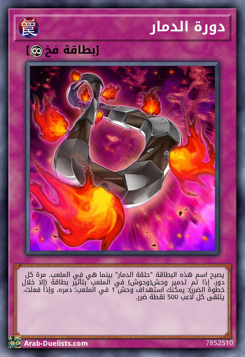 يصبح اسم هذه البطاقة "حلقة الدمار" بينما هي في الملعب. مرة كل دور، إذا تم تدمير وحش(وحوش) في الملعب بتأثير بطاقة (إلا خلال خطوة الضرر): يمكنك استهداف وحش 1 في الملعب؛ دمره، وإذا فعلت، يتلقى كل لاعب 500 نقطة ضرر. |
