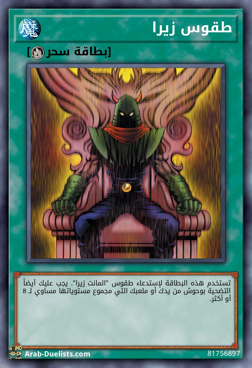 تستخدم هذه البطاقة لإستدعاء طقوس "المانت زيرا". يجب عليك أيضاً التضحية بوحوش من يدك أو ملعبك التي مجموع مستوياتها مساوي لـ 8 أو أكثر. |