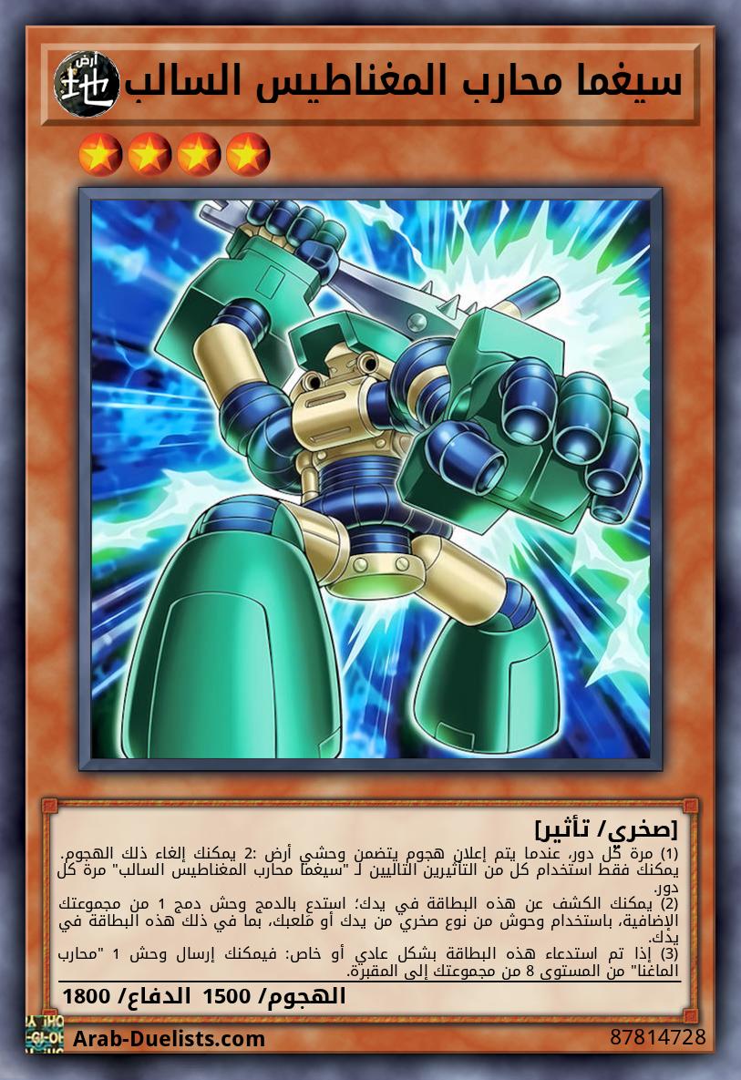 (1) مرة كل دور، عندما يتم إعلان هجوم يتضمن وحشي أرض 2: يمكنك إلغاء ذلك الهجوم. يمكنك فقط استخدام كل من التأثيرين التاليين لـ "سيغما محارب المغناطيس السالب" مرة كل دور. |