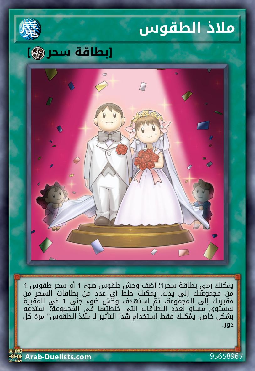 يمكنك رمي بطاقة سحر1؛ أضف وحش طقوس ضوء 1 أو سحر طقوس 1 من مجموعتك إلى يدك. يمكنك خلط أي عدد من بطاقات السحر من مقبرتك إلى المجموعة، ثمّ استهدف وحش ضوء جني 1 في المقبرة بمستوى مساوٍ لعدد البطاقات التي خلطتها في المجموعة؛ استدعه بشكل خاص. يمكنك فقط استخدام هذا التأثير لـ ملاذ الطقوس" مرة كل دور. |