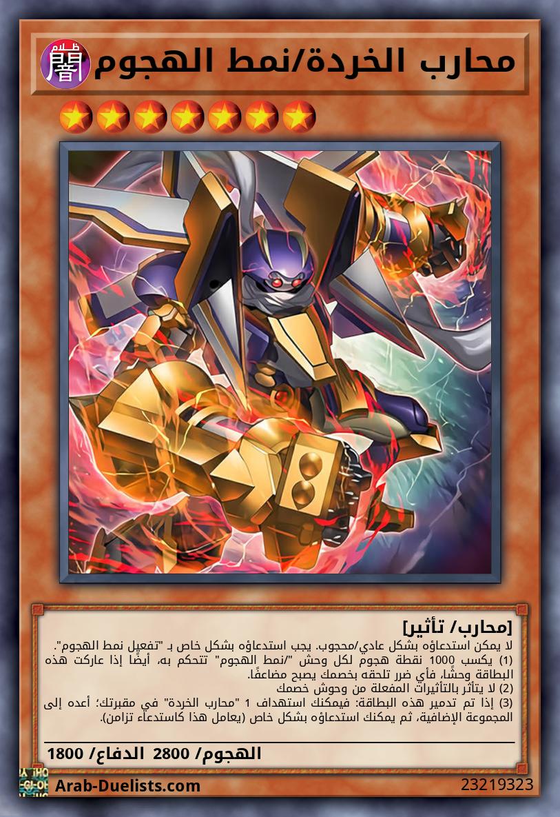 لا يمكن استدعاؤه بشكل عادي/محجوب. يجب استدعاؤه بشكل خاص بـ "تفعيل نمط الهجوم". (1) يكسب 1000 نقطة هجوم لكل وحش "/نمط الهجوم" تتحكم به، أيضًا إذا عاركت هذه البطاقة وحشًا، فأي ضرر تلحقه بخصمك يصبح مضاعفًا. (2) لا يتأثر بالتأثيرات المفعلة من وحوش خصمك (3) إذا تم تدمير هذه البطاقة: فيمكنك استهداف 1 "محارب الخردة" في مقبرتك؛ أعده إلى المجموعة الإضافية، ثم يمكنك استدعاؤه بشكل خاص (يعامل هذا كاستدعاء تزامن).