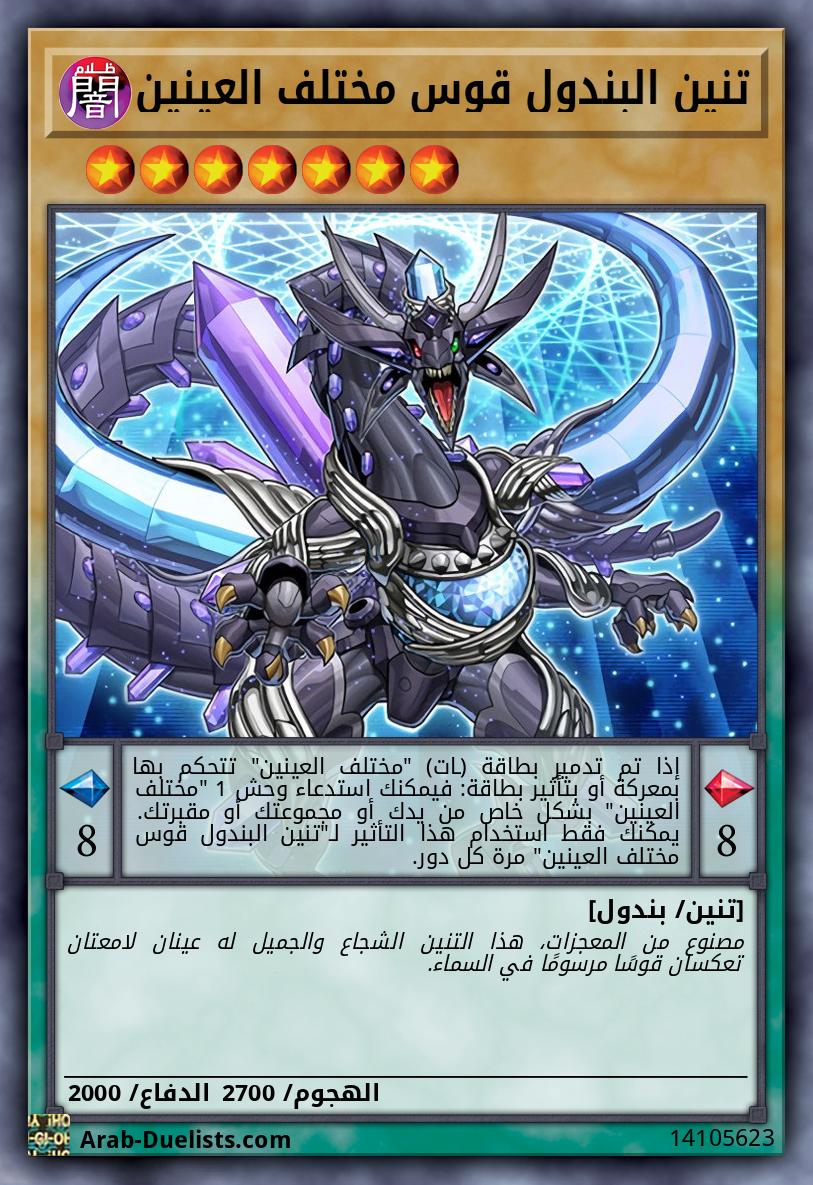 وحشان 2 من نوع تنين من المستوى 7 إذا كان بإمكانك استدعاء وحش من المستوى 7 بالبندول، فيمكنك استدعاء هذه البطاقة المكشوفة بالبندول من مجموعتك الإضافية. (1) إذا تم تدمير هذه البطاقة في منطقة الوحوش: فيمكنك وضعها في منطقة بندول لك. (2) إذا تم استدعاء هذه البطاقة بالإكسيز باستخدام وحش إكسيز كمادة إكسيز، فتكسب هذه التأثيرات: ● يمكنها القيام بهجوم ثانٍ خلال كل مرحلة معركة. ● مرة كل الدور: يمكنك فصل مادة إكسيز 1 من هذه البطاقة؛ دمّر أكبر عدد ممكن من البطاقات التي يتحكم بها خصمك، و إذا فعلت، فتكسب هذه البطاقة 200 نقطة هجوم لكل بطاقة تم تدميرها، حتى نهاية هذا الدور.