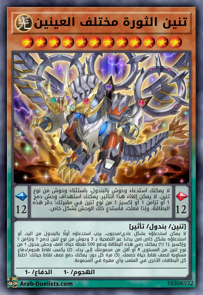 وحشان 2 من المستوى 7 يمكنك أيضاً استدعاء هذه البطاقة بالإكسيز باستخدام وحش إكسيز "تمرد" تتحكم به كمادة. (انقل مواده إلى هذه البطاقة). إذا كان بإمكانك استدعاء وحش من المستوى 7 بالبندول، فيمكنك استدعاء هذه البطاقة المكشوفة بالبندول من مجموعتك الإضافية. (1) يمكن لهذه البطاقة المستدعاة بالإكسيز باستخدام وحش إكسيز من الرتبة 7 كمادة القيام بهجوم ثانٍ و ثالث خلال كل مرحلة معركة. (3) إذا تم تدمير هذه البطاقة في منطقة الوحوش: فيمكنك وضعها في منطقة بندول لك. يمكنك فقط استدعاء "تنين التمرد مختلف العينين - السيد" بشكل خاص مرة كل دور.
