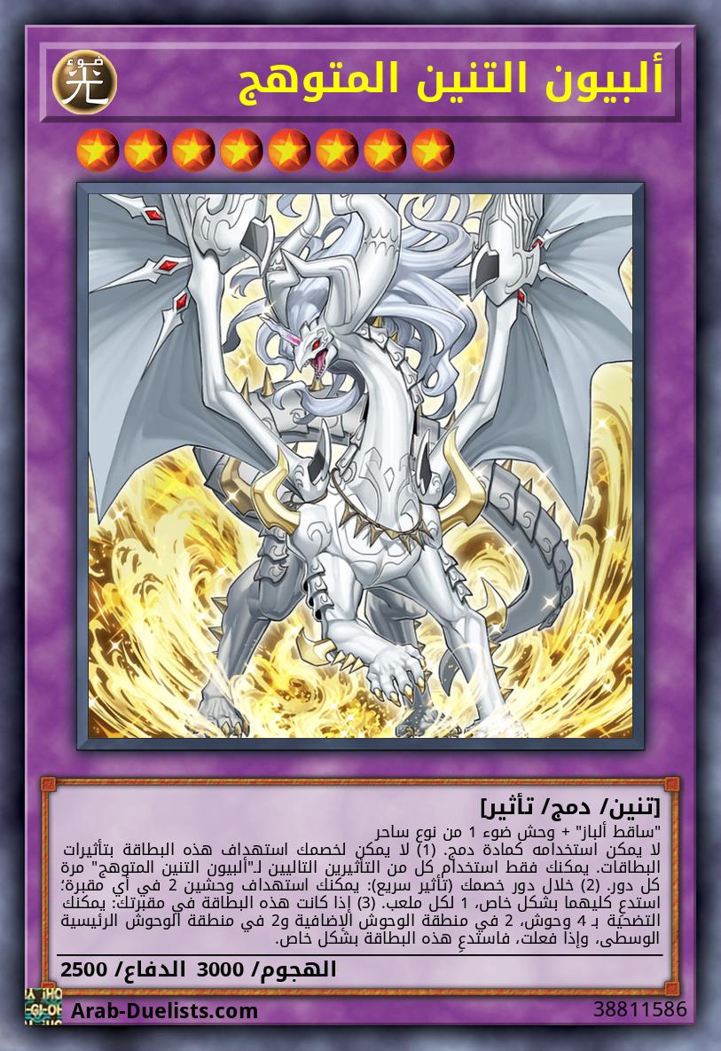 "ساقط ألباز" + وحش ضوء 1 من نوع ساحر لا يمكن استخدامه كمادة دمج. (1) لا يمكن لخصمك استهداف هذه البطاقة بتأثيرات البطاقات. يمكنك فقط استخدام كل من التأثيرين التاليين لـ"ألبيون التنين المتوهج" مرة كل دور. (2) خلال دور خصمك (تأثير سريع): يمكنك استهداف وحشين 2 في أي مقبرة؛ استدعِ كليهما بشكل خاص، 1 لكل ملعب. (3) إذا كانت هذه البطاقة في مقبرتك: يمكنك التضحية بـ 4 وحوش، 2 في منطقة الوحوش الإضافية و2 في منطقة الوحوش الرئيسية الوسطى، وإذا فعلت، فاستدعِ هذه البطاقة بشكل خاص.
