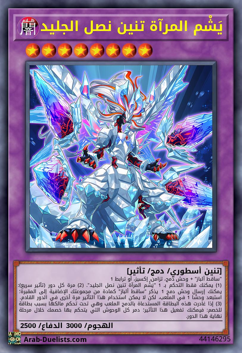 "ساقط ألباز" + وحش دمج، تزامن، إكسيز، أو ترابط 1 (1) يمكنك فقط التحكم بـ 1 "يَشْم المرآة تنين نصل الجليد". (2) مرة كل دور (تأثير سريع): يمكنك إرسال وحش دمج 1 يذكر "ساقط ألباز" كمادة من مجموعتك الإضافية إلى المقبرة؛ استبعد وحشًا 1 في الملعب، لكن لا يمكن استخدام هذا التأثير مرة أخرى في الدور القادم. (3) إذا غادرت هذه البطاقة المستدعاة بالدمج الملعب وهي تحت تحكم مالكها بسبب بطاقة للخصم: فيمكنك تفعيل هذا التأثير؛ دمر كل الوحوش التي يتحكم بها خصمك خلال مرحلة نهاية هذا الدور.