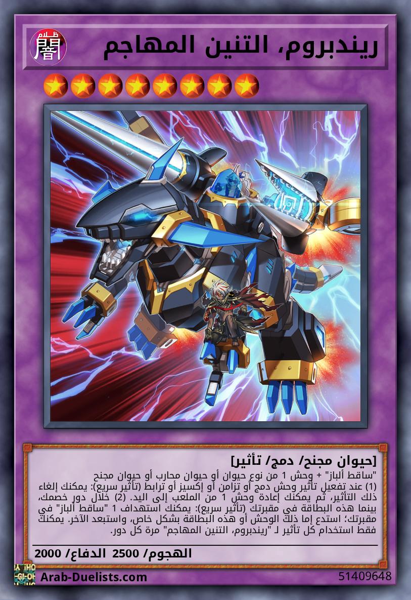 "ساقط ألباز" + وحش 1 من نوع حيوان أو حيوان محارب أو حيوان مجنح (1) عند تفعيل تأثير وحش دمج أو تزامن أو إكسيز أو ترابط (تأثير سريع): يمكنك إلغاء ذلك التأثير، ثم يمكنك إعادة وحش 1 من الملعب إلى اليد. (2) خلال دور خصمك، بينما هذه البطاقة في مقبرتك (تأثير سريع): يمكنك استهداف 1 "ساقط ألباز" في مقبرتك؛ استدع إما ذلك الوحش أو هذه البطاقة بشكل خاص، واستبعد الآخر. يمكنك فقط استخدام كل تأثير لـ "ريندبروم، التنين المهاجم" مرة كل دور.