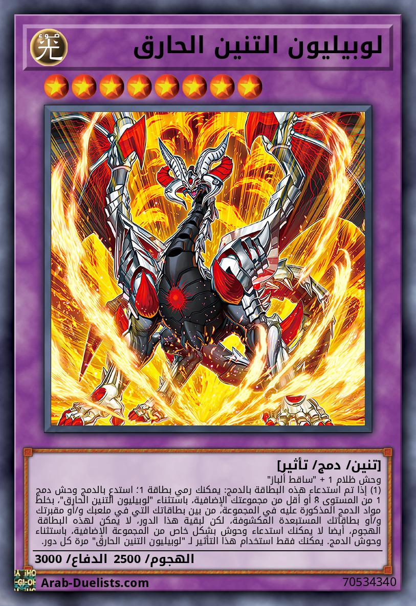 وحش ظلام 1 + "ساقط ألباز" (1) إذا تم استدعاء هذه البطاقة بالدمج: يمكنك رمي بطاقة 1؛ استدعِ بالدمج وحش دمج 1 من المستوى 8 أو أقل من مجموعتك الإضافية، باستثناء "لوبيليون التنين الحارق"، بخلط مواد الدمج المذكورة عليه في المجموعة، من بين بطاقاتك التي في ملعبك و/أو مقبرتك و/أو بطاقاتك المستبعدة المكشوفة، لكن لبقية هذا الدور، لا يمكن لهذه البطاقة الهجوم، أيضا لا يمكنك استدعاء وحوش بشكل خاص من المجموعة الإضافية، باستثناء وحوش الدمج. يمكنك فقط استخدام هذا التأثير لـ "لوبيليون التنين الحارق" مرة كل دور.