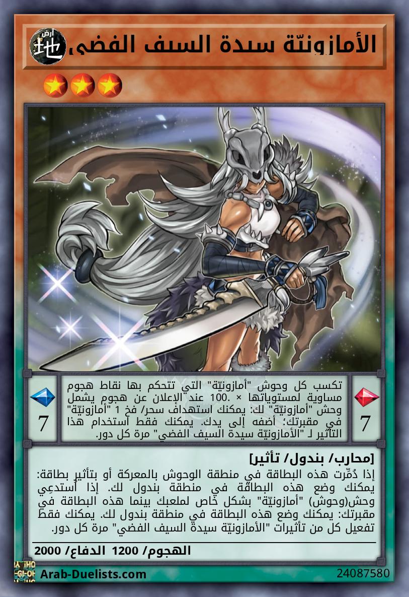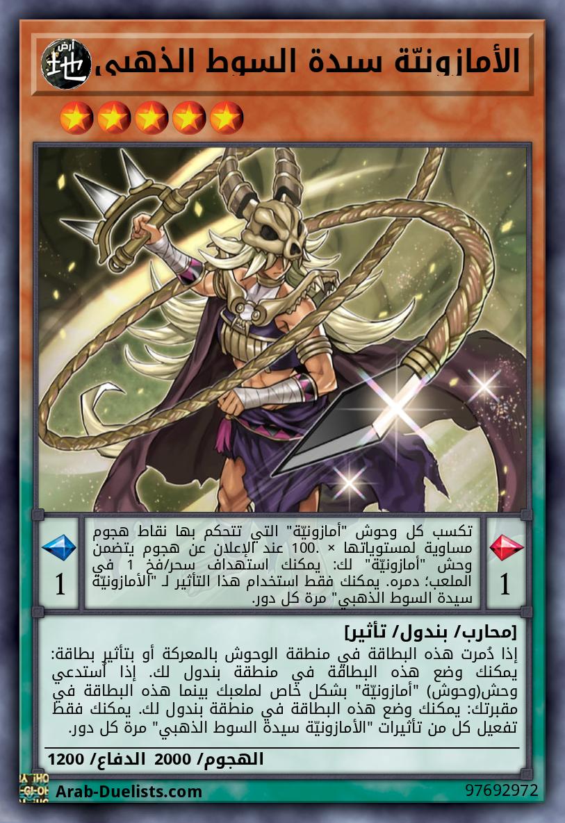 "الملكة الأمازونيّة" + وحش 1 "أمازونيّة" لا يمكن تدمير بطاقات "أمازونيّة" التي تتحكم بها بالمعركة أو بتأثيرات البطاقات. إذا هاجم وحش "أمازونيّة" لك وحشا في وضعية الدفاع، ألحق ضرر معركة نافذا بخصمك. إذا دُمِّرت هذه البطاقة المكشوفة المستدعاة بالدمج بالمعركة، أو غادرت الملعب بسبب تأثير بطاقة الخصم بينما يتحكم بها صاحبها: يمكنك استدعاء "الملكة الأمازونيّة" من يدك، مجموعتك، أو مقبرتك بشكل خاص.
