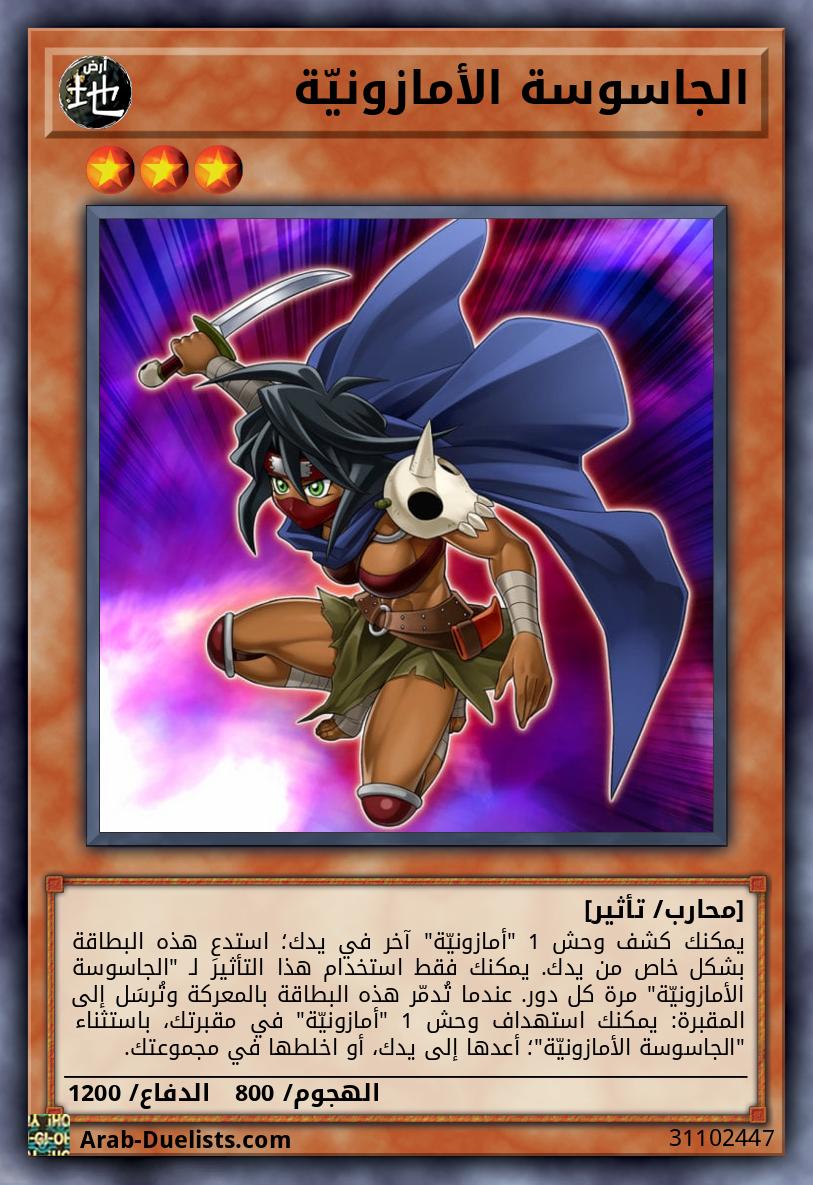 يمكنك كشف وحش 1 "أمازونيّة" آخر في يدك؛ استدعِ هذه البطاقة بشكل خاص من يدك. يمكنك فقط استخدام هذا التأثير لـ "الجاسوسة الأمازونيّة" مرة كل دور. عندما تُدمّر هذه البطاقة بالمعركة وتُرسَل إلى المقبرة: يمكنك استهداف وحش 1 "أمازونيّة" في مقبرتك، باستثناء "الجاسوسة الأمازونيّة"؛ أعدها إلى يدك، أو اخلطها في مجموعتك.