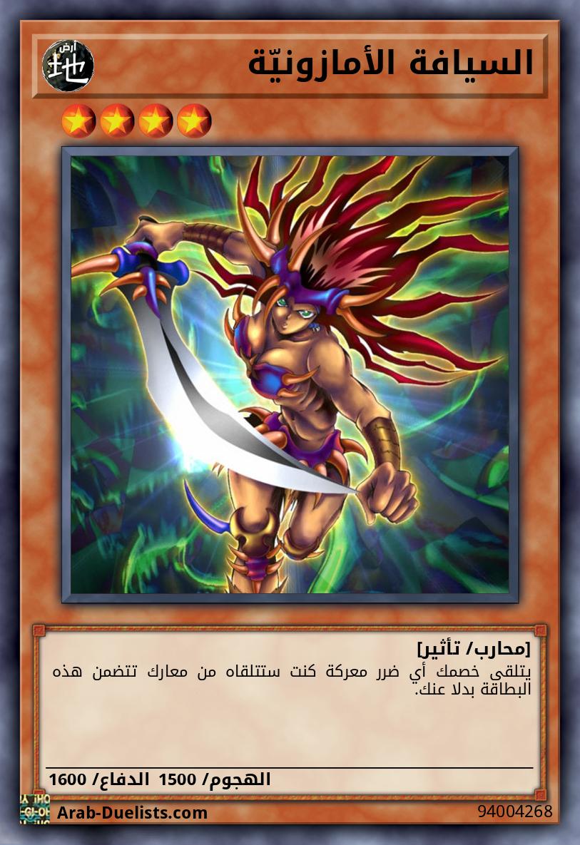 جهِّزها فقط لوحش "أمازونيّة". مرة واحدة كل دور، لا يمكن تدمير ذلك الوحش في المعركة. بعد حساب الضرر، إذا هاجم الوحش المجهَّز وحشا: دمّر الوحش المُهاجَم.