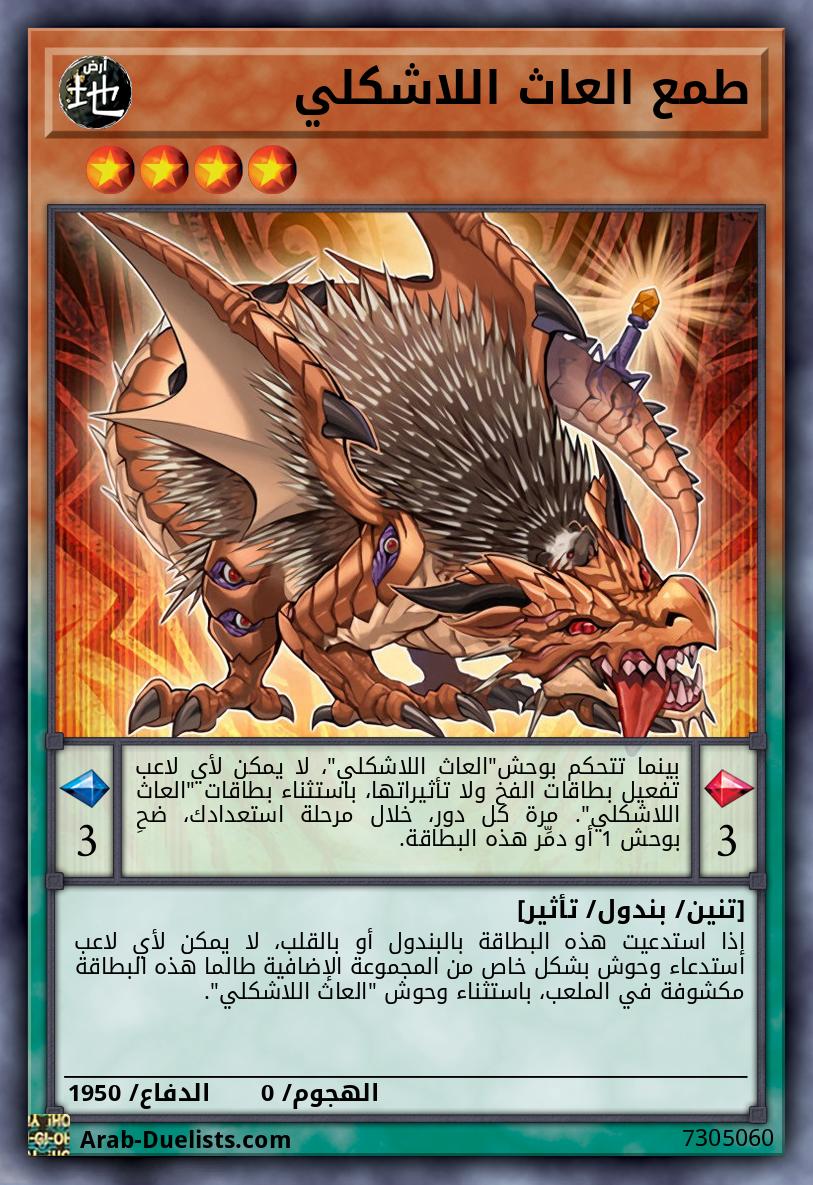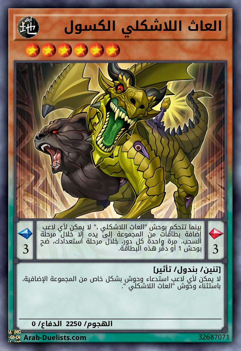إذا استدعيت هذه البطاقة بالبندول أو بالقلب، فلن يمكن لأي لاعب استدعاء وحوش بشكل خاصة من المجموعة الإضافية طالما هذه البطاقة مكشوفة قي الملعب، باستثناء وحوش "العاث اللاشكلي".