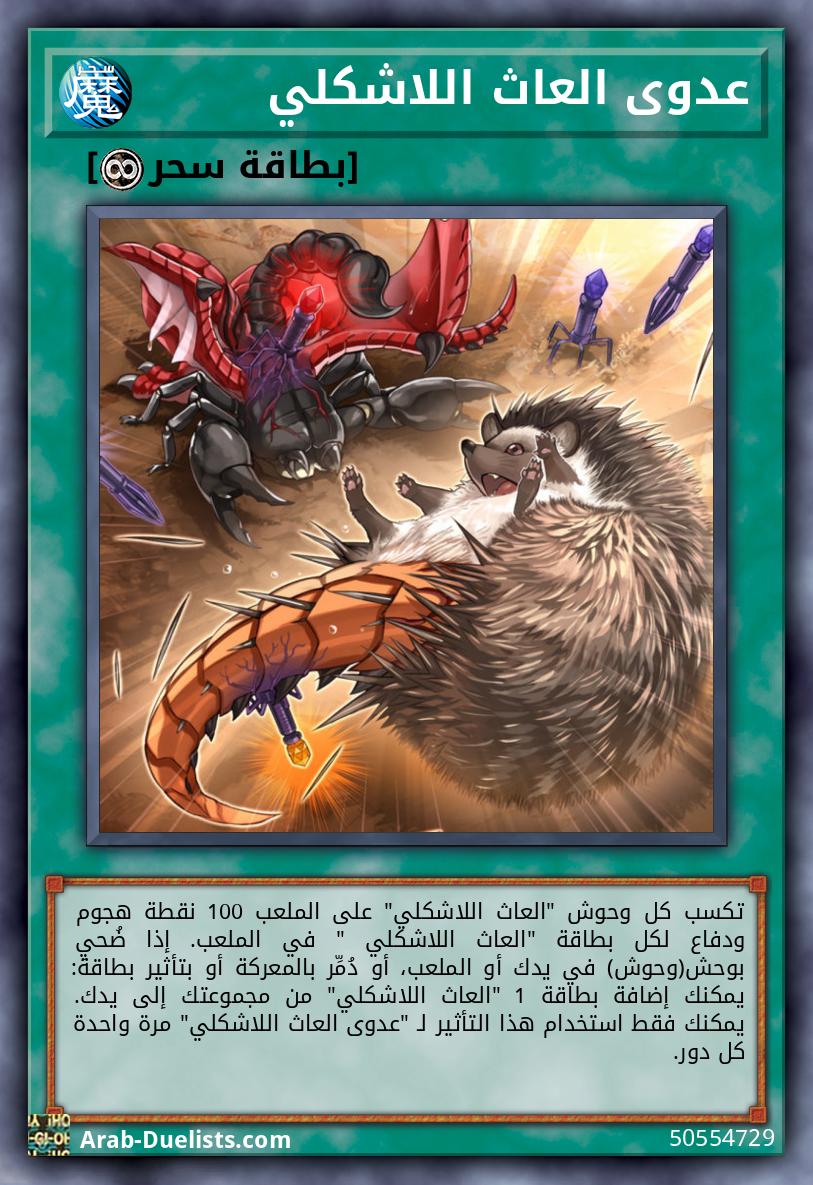 تكسب كل وحوش "العاث اللاشكلي" على الملعب 100 نقطة هجوم ودفاع لكل بطاقة "العاث اللاشكلي " في الملعب. إذا ضُحيِ بوحش(وحوش) في يدك أو الملعب، أو دُمِّر بالمعركة أو بتأثير بطاقة: يمكنك إضافة بطاقة 1 "العاث اللاشكلي" من مجموعتك إلى يدك. يمكنك فقط استخدام هذا التأثير لـ "عدوى العاث اللاشكلي" مرة واحدة كل دور.