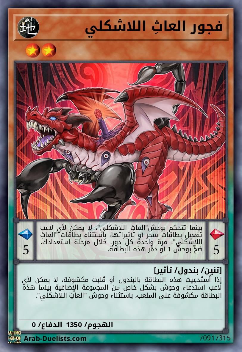 تخسر جميع الوحوش على الملعب، باستثناء وحوش "العاث اللاشكلي"، 100 نقطة هجوم ودفاع لكل بطاقة "العاث اللاشكلي" على الملعب. إذا دٌمَّرت بطاقة(بطاقات) في منطقة بندولك (إلا خلال حساب الضرر): يمكنك وضع وحش بندول 1 "العاث اللاشكلي" من مجموعتك إلى منطقة بندولك. يمكنك فقط استخدام هذا تأثير لـ"تحلل العاث اللاشكلي" مرة واحدة كل دور.