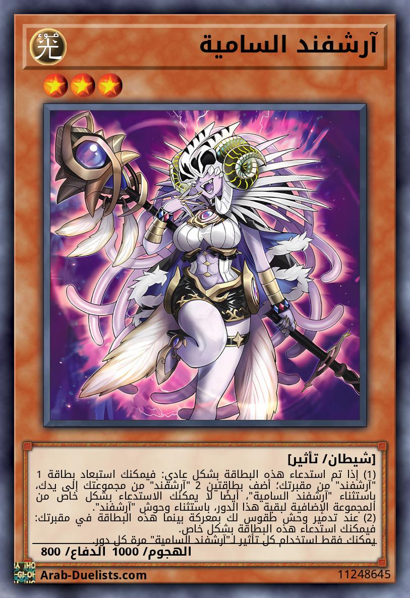 (1) إذا تم استدعاء هذه البطاقة بشكل عادي: فيمكنك استبعاد بطاقة 1 "آرشفند" من مقبرتك؛ أضف بطاقتين 2 "آرشفند" من مجموعتك إلى يدك، باستثناء "آرشفند السامية"، أيضًا لا يمكنك الاستدعاء بشكل خاص من المجموعة الإضافية لبقية هذا الدور، باستثناء وحوش "آرشفند". (2) عند تدمير وحش طقوس لك بمعركة بينما هذه البطاقة في مقبرتك: فيمكنك استدعاء هذه البطاقة بشكل خاص. يمكنك فقط استخدام كل تأثير لـ"آرشفند السامية" مرة كل دور.