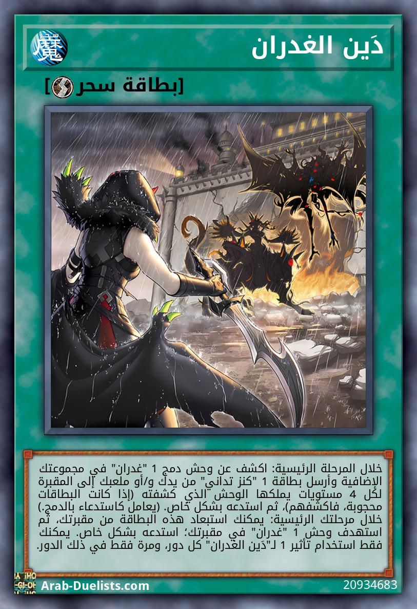 خلال المرحلة الرئيسية: اكشف عن وحش دمج 1 "غدران" في مجموعتك الإضافية وأرسل بطاقة 1 "كنز تداني" من يدك و/أو ملعبك إلى المقبرة لكل 4 مستويات يملكها الوحش الذي كشفته (إذا كانت البطاقات محجوبة، فاكشفهم)، ثم استدعه بشكل خاص. (يعامل كاستدعاء بالدمج.) خلال مرحلتك الرئيسية: يمكنك استبعاد هذه البطاقة من مقبرتك، ثم استهدف وحش 1 "غدران" في مقبرتك؛ استدعه بشكل خاص. يمكنك فقط استخدام تأثير 1 لـ"دَين الغدران" كل دور، ومرة فقط في ذلك الدور.