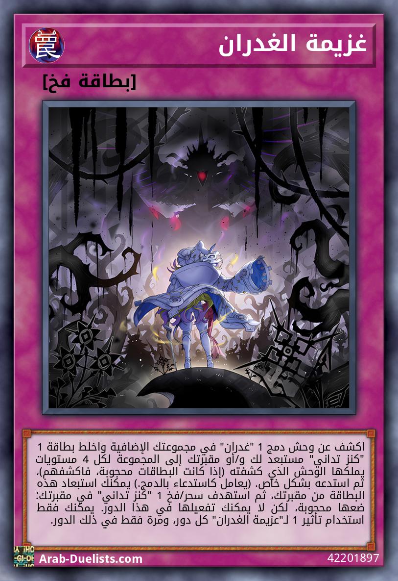 اكشف عن وحش دمج 1 "غدران" في مجموعتك الإضافية واخلط بطاقة 1 "كنز تداني" مستبعد لك و/أو مقبرتك إلى المجموعة لكل 4 مستويات يملكها الوحش الذي كشفته (إذا كانت البطاقات محجوبة، فاكشفهم)، ثم استدعه بشكل خاص. (يعامل كاستدعاء بالدمج.) يمكنك استبعاد هذه البطاقة من مقبرتك، ثم استهدف سحر/فخ 1 "كنز تداني" في مقبرتك؛ ضعها محجوبة، لكن لا يمكنك تفعيلها في هذا الدور. يمكنك فقط استخدام تأثير 1 لـ"عزيمة الغدران" كل دور، ومرة فقط في ذلك الدور.