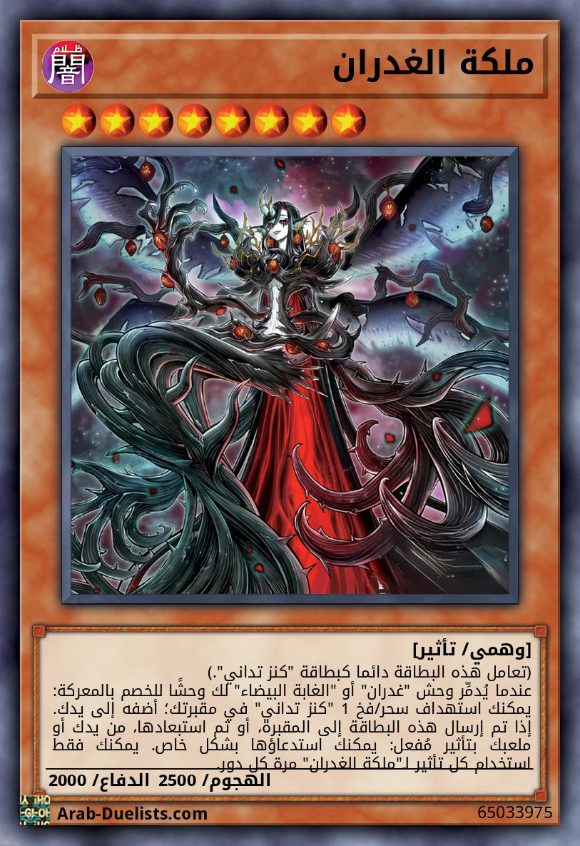 "ملكة الغدران" + وحش دمج أو تزامن 1 يجب أولًا إما استدعاؤه بالدمج، أو بشكل خاص (من مجموعتك الإضافية) بالتضحية بـ 1 "قديسة الغدران" تتحكم به ووحش 1 مكشوف يتحكم به خصمك. (1) لا يمكن تدميرها بتأثيرات البطاقات. (2) في كل مرة يفعل فيها خصمك بطاقة أو تأثيرها، تخسر كل الوحوش التي يتحكم بها خصمك 500 نقطة هجوم عند التنفيذ. (3) لا يمكن لخصمك تفعيل تأثيرات الوحوش بـ 0 نقطة هجوم.