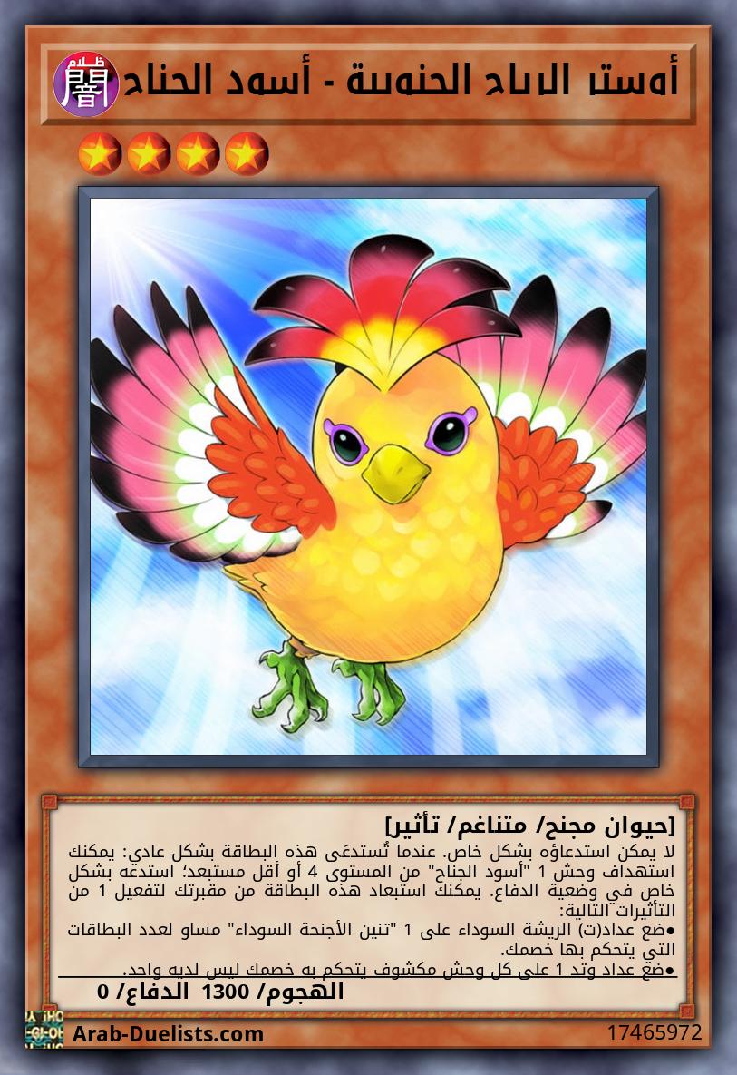 لا يمكن استدعاؤه بشكل خاص. عندما تُستدعَى هذه البطاقة بشكل عادي: يمكنك استهداف وحش 1 "أسود الجناح" من المستوى 4 أو أقل مستبعد؛ استدعه بشكل خاص في وضعية الدفاع. يمكنك استبعاد هذه البطاقة من مقبرتك لتفعيل 1 من التأثيرات التالية: ●ضع عداد(ت) الريشة السوداء على 1 "تنين الأجنحة السوداء" مساو لعدد البطاقات التي يتحكم بها خصمك. ●ضع عداد وتد 1 على كل وحش مكشوف يتحكم به خصمك ليس لديه واحد.