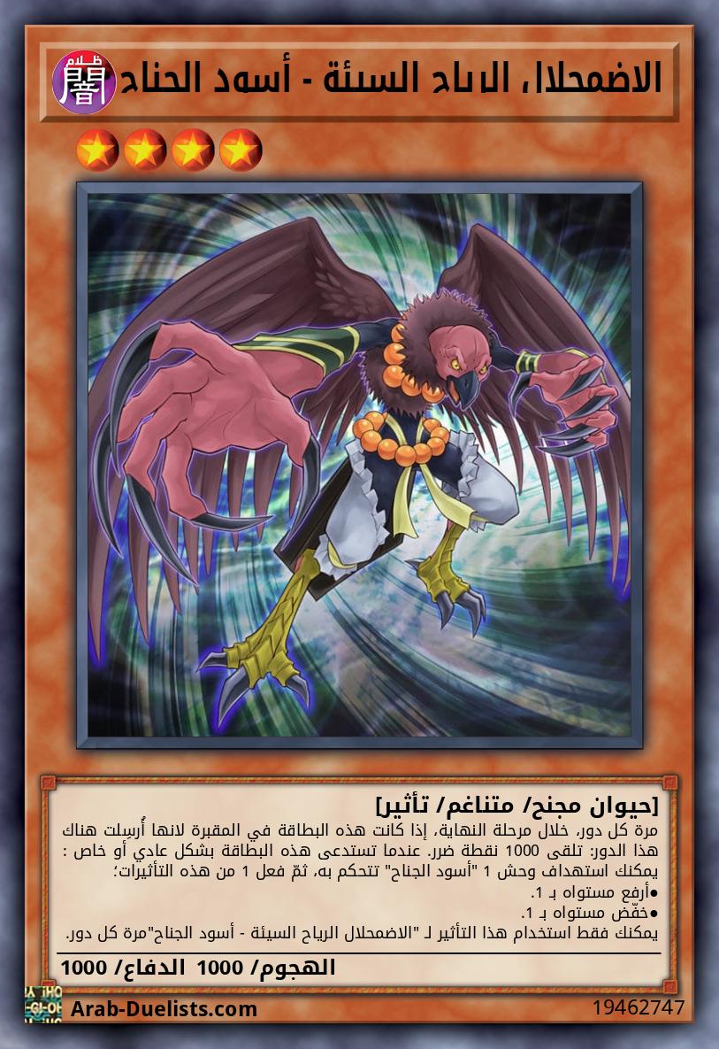مرة كل دور، خلال مرحلة النهاية، إذا كانت هذه البطاقة في المقبرة لانها أُرسِلت هناك هذا الدور: تلقى 1000 نقطة ضرر. عندما تستدعى هذه البطاقة بشكل عادي أو خاص : يمكنك استهداف وحش 1 "أسود الجناح" تتحكم به، ثمّ فعل 1 من هذه التأثيرات؛ ●أرفع مستواه بـ 1. ●خفّض مستواه بـ 1. يمكنك فقط استخدام هذا التأثير لـ "الاضمحلال الرياح السيئة - أسود الجناح"مرة كل دور.