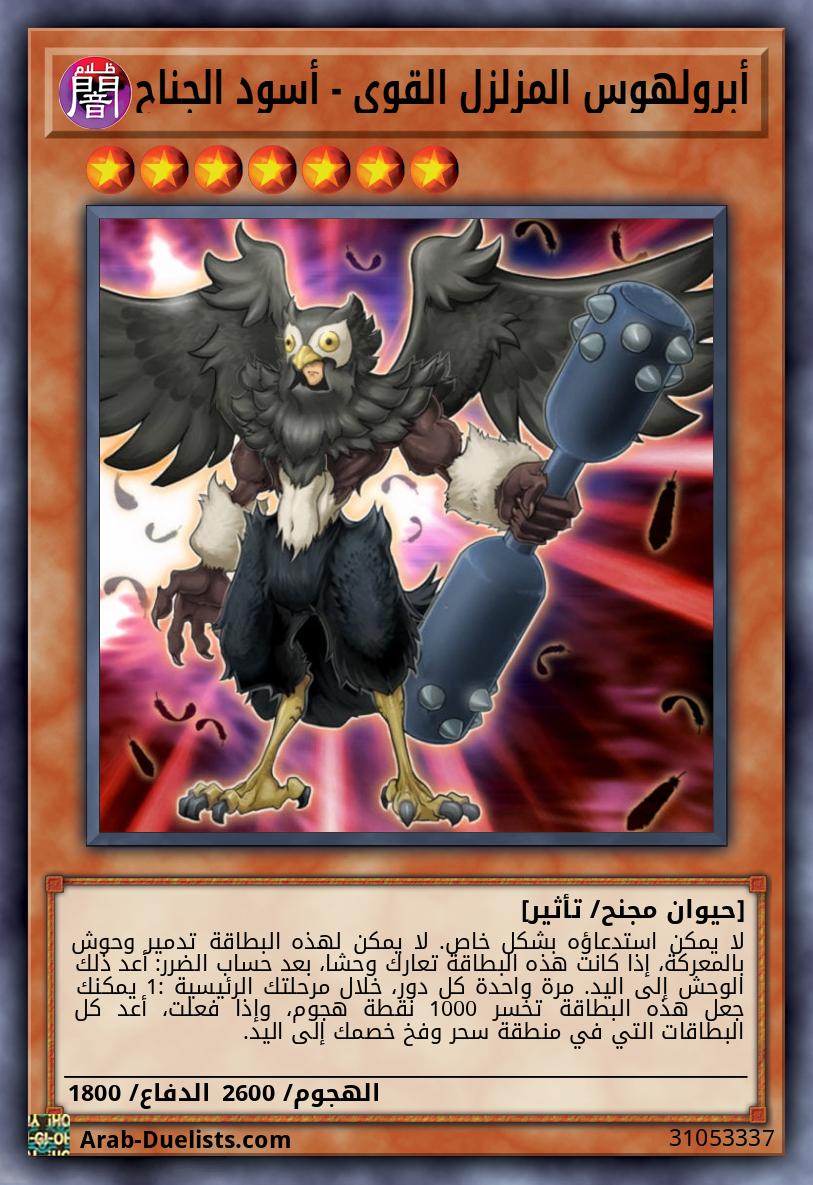 لا يمكن استدعاؤه بشكل خاص. لا يمكن لهذه البطاقة تدمير وحوش بالمعركة، إذا كانت هذه البطاقة تعارك وحشا، بعد حساب الضرر: أعد ذلك الوحش إلى اليد. مرة واحدة كل دور، خلال مرحلتك الرئيسية 1: يمكنك جعل هذه البطاقة تخسر 1000 نقطة هجوم، وإذا فعلت، أعد كل البطاقات التي في منطقة سحر وفخ خصمك إلى اليد.