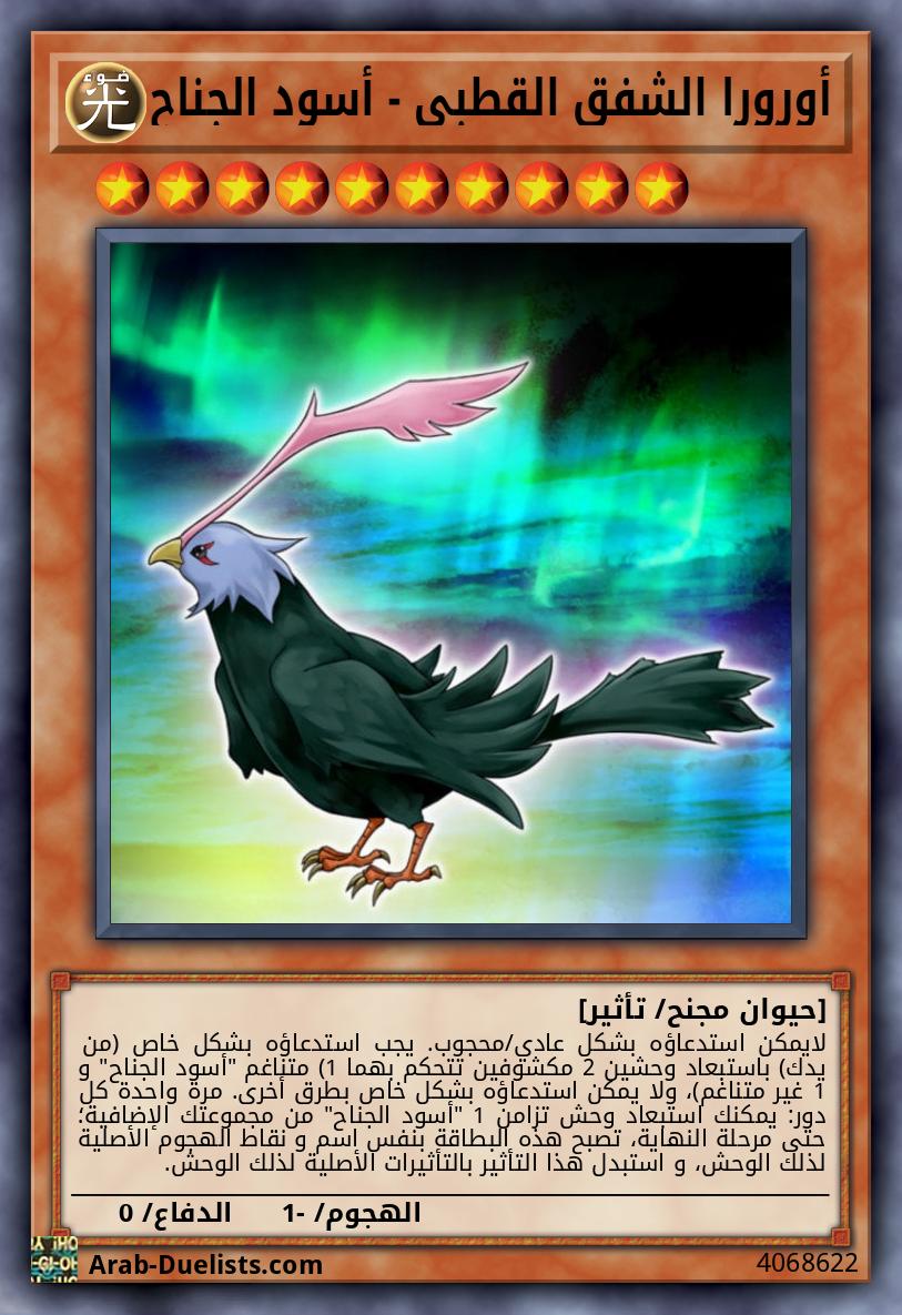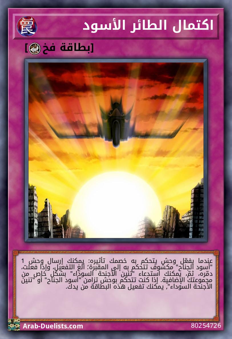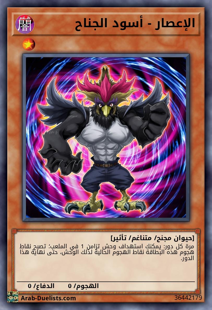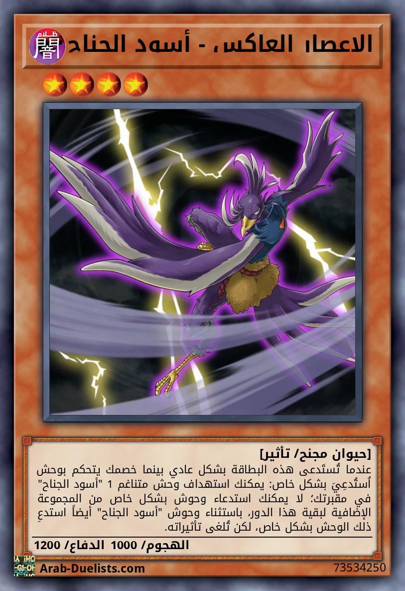 لايمكن استدعاؤه بشكل عادي/محجوب. يجب استدعاؤه بشكل خاص (من يدك) باستبعاد وحشين 2 مكشوفين تتحكم بهما (1 متناغم "أسود الجناح" و 1 غير متناغم)، ولا يمكن استدعاؤه بشكل خاص بطرق أخرى. مرة واحدة كل دور: يمكنك استبعاد وحش تزامن 1 "أسود الجناح" من مجموعتك الإضافية؛ حتى مرحلة النهاية، تصبح هذه البطاقة بنفس اسم و نقاط الهجوم الأصلية لذلك الوحش، و استبدل هذا التأثير بالتأثيرات الأصلية لذلك الوحش.