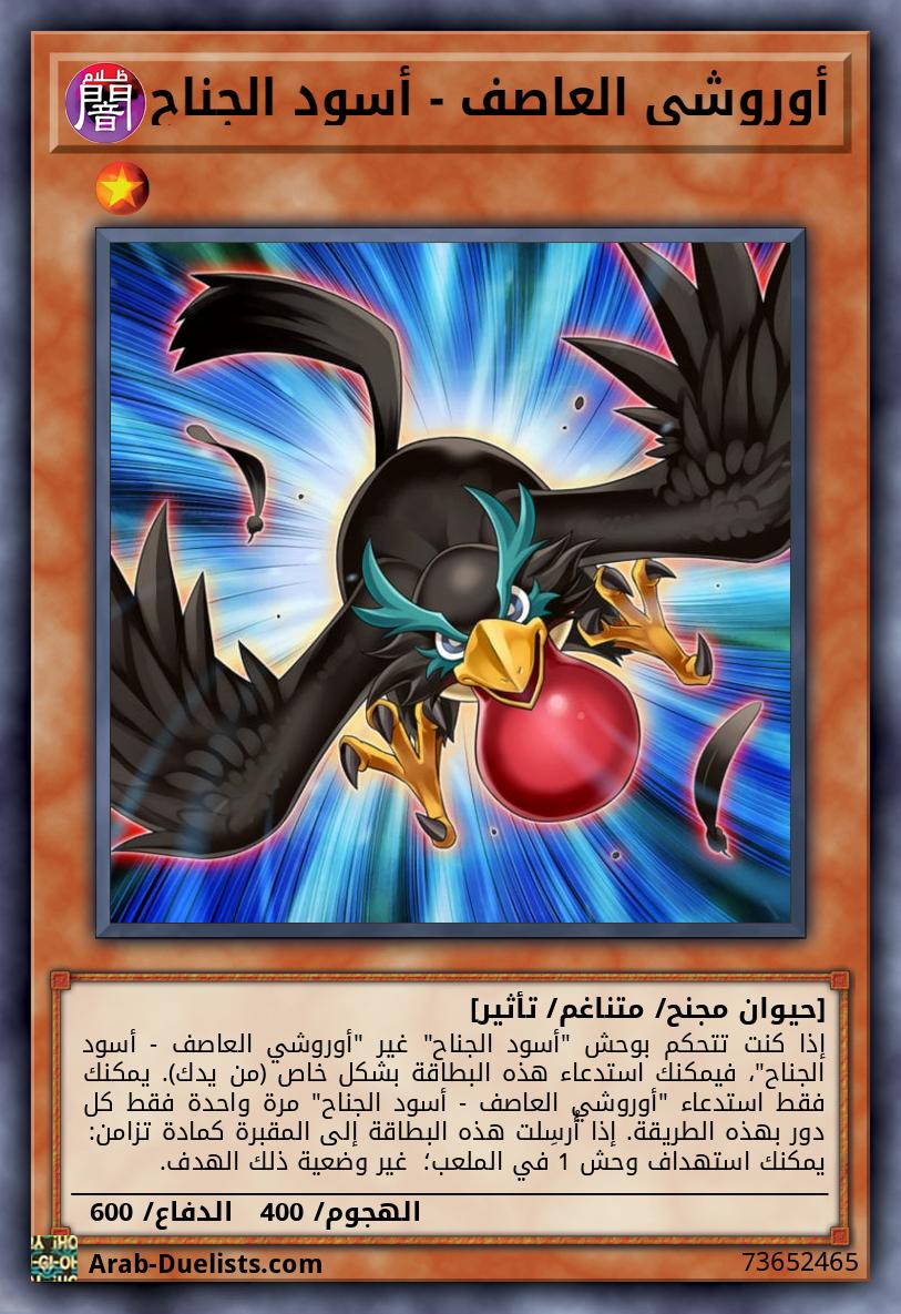 إذا كنت تتحكم بوحش "أسود الجناح" غير "أوروشي العاصف - أسود الجناح"، فيمكنك استدعاء هذه البطاقة بشكل خاص (من يدك). يمكنك فقط استدعاء "أوروشي العاصف - أسود الجناح" مرة واحدة فقط كل دور بهذه الطريقة. إذا أُرسِلت هذه البطاقة إلى المقبرة كمادة تزامن: يمكنك استهداف وحش 1 في الملعب؛ غير وضعية ذلك الهدف.