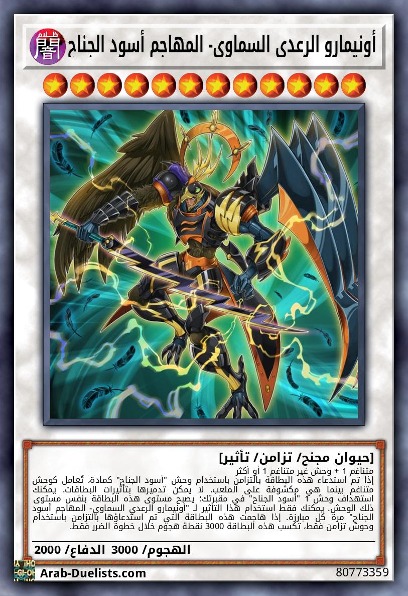 متناغم 1 + وحش غير متناغم 1 أو أكثر إذا تم استدعاء هذه البطاقة بالتزامن باستخدام وحش "أسود الجناح" كمادة، تُعامل كوحش متناغم بينما هي مكشوفة على الملعب. لا يمكن تدميرها بتأثيرات البطاقات. يمكنك استهداف وحش 1 "أسود الجناح" في مقبرتك؛ يصبح مستوى هذه البطاقة بنفس مستوى ذلك الوحش. يمكنك فقط استخدام هذا التأثير لـ "أونيمارو الرعدي السماوي- المهاجم أسود الجناح" مرة كل مبارزة. إذا هاجمت هذه البطاقة التي تم استدعاؤها بالتزامن باستخدام وحوش تزامن فقط، تكسب هذه البطاقة 3000 نقطة هجوم خلال خطوة الضرر فقط.