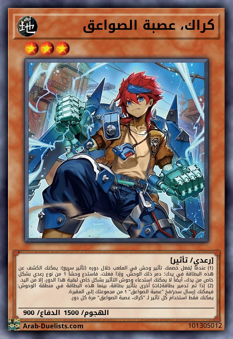 (1) عندما يُفعل خصمك تأثير وحش في الملعب خلال دوره (تأثير سريع): يمكنك الكشف عن هذه البطاقة في يدك؛ دمر ذلك الوحش، وإذا فعلت، فاستدعِ وحشاً 1 من نوع رعدي بشكل خاص من يدك، أيضاً لا يمكنك استدعاء وحوش التأثير بشكل خاص لبقية هذا الدور، إلا من اليد. (2) إذا تم تدمير بطاقة(ـات) أخرى بتأثير بطاقة، بينما هذه البطاقة في منطقة الوحوش: فيمكنك إرسال سحر/فخ "عصبة الصواعق" 1 من مجموعتك إلى المقبرة. يمكنك فقط استخدام كل تأثير لـ "كراك، عصبة الصواعق" مرة كل دور.