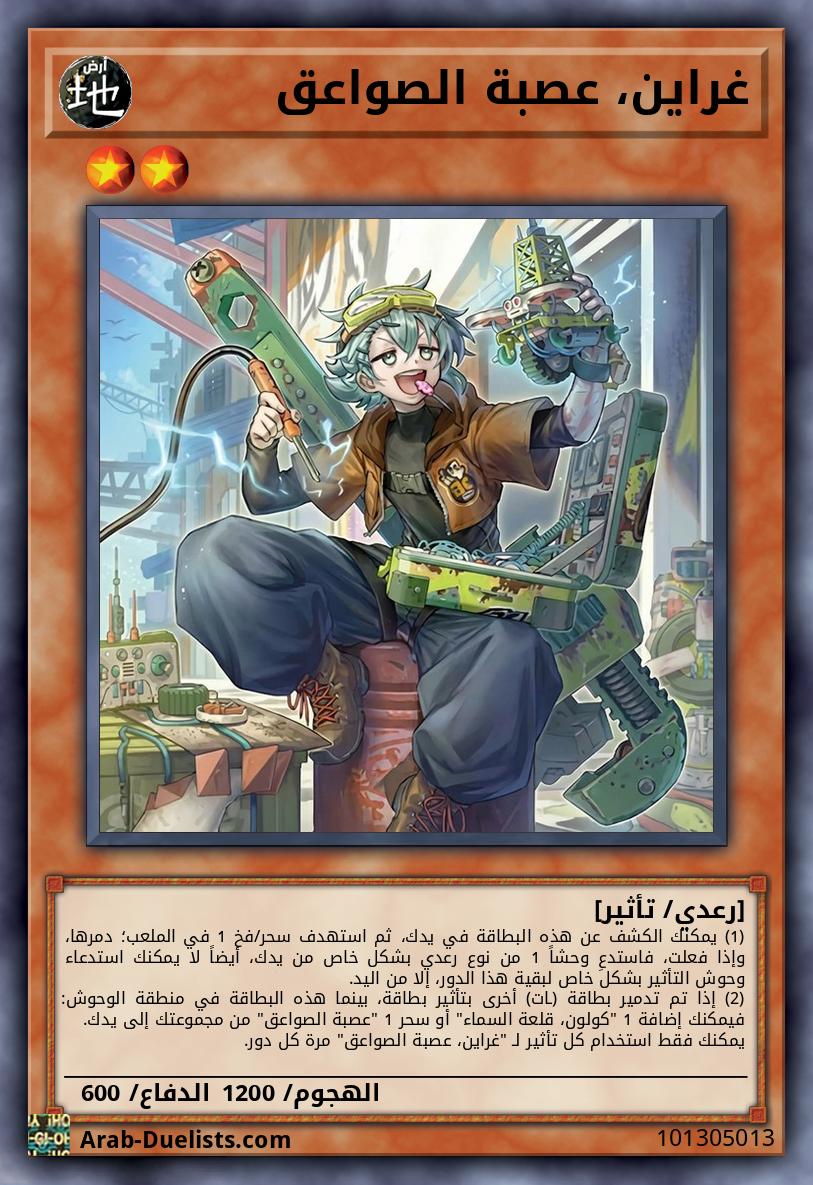 (1) يمكنك الكشف عن هذه البطاقة في يدك، ثم استهدف سحر/فخ 1 في الملعب؛ دمرها، وإذا فعلت، فاستدعِ وحشاً 1 من نوع رعدي بشكل خاص من يدك، أيضاً لا يمكنك استدعاء وحوش التأثير بشكل خاص لبقية هذا الدور، إلا من اليد. (2) إذا تم تدمير بطاقة (ـات) أخرى بتأثير بطاقة، بينما هذه البطاقة في منطقة الوحوش: فيمكنك إضافة 1 "كولون، قلعة السماء" أو سحر 1 "عصبة الصواعق" من مجموعتك إلى يدك. يمكنك فقط استخدام كل تأثير لـ "غراين، عصبة الصواعق" مرة كل دور.