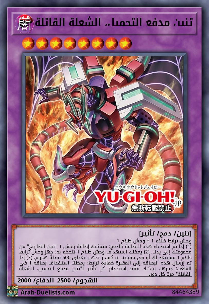 وحش ترابط ظلام 1 + وحش ظلام 1 (1) إذا تم استدعاء هذه البطاقة بالدمج: فيمكنك إضافة وحش 1 "تنين الصاروخ" من مجموعتك إلى يدك. (2) يمكنك استهداف وحش ظلام 1 تتحكم به؛ جهز وحش ترابط ظلام 1 مستبعد لك أو في مقبرته له كسحر تجهيز يعطي 500 نقطة هجوم. (3) إذا تم إرسال هذه البطاقة إلى المقبرة كمادة ترابط: يمكنك استهداف بطاقة 1 في الملعب؛ دمرها. يمكنك فقط استخدام كل تأثير لـ"تنين مدفع التحميل، الشعلة القاتلة" مرة كل دور.