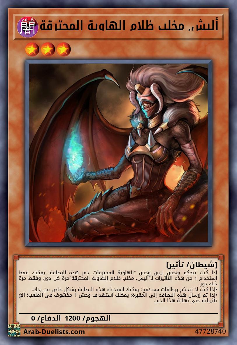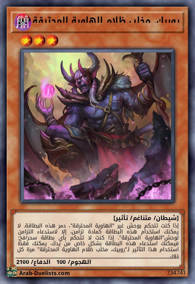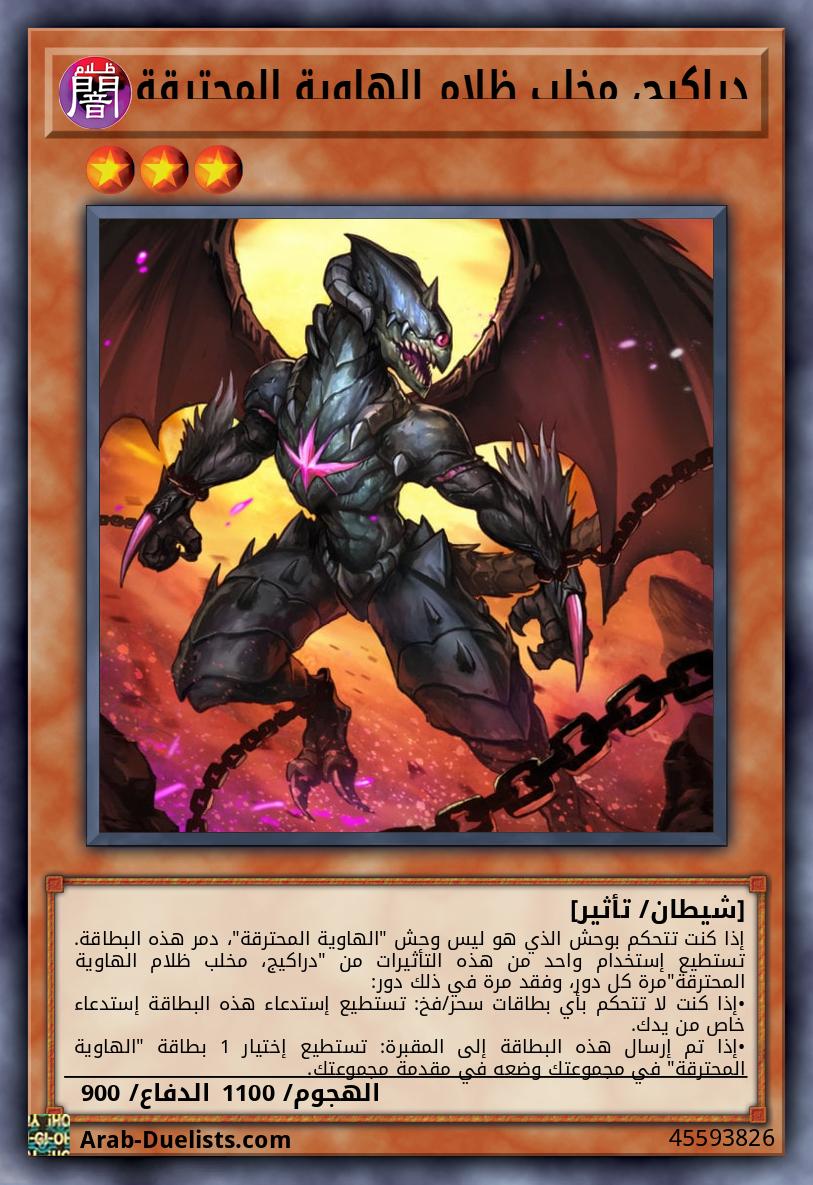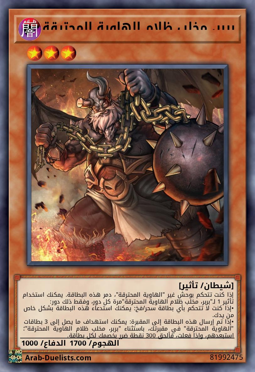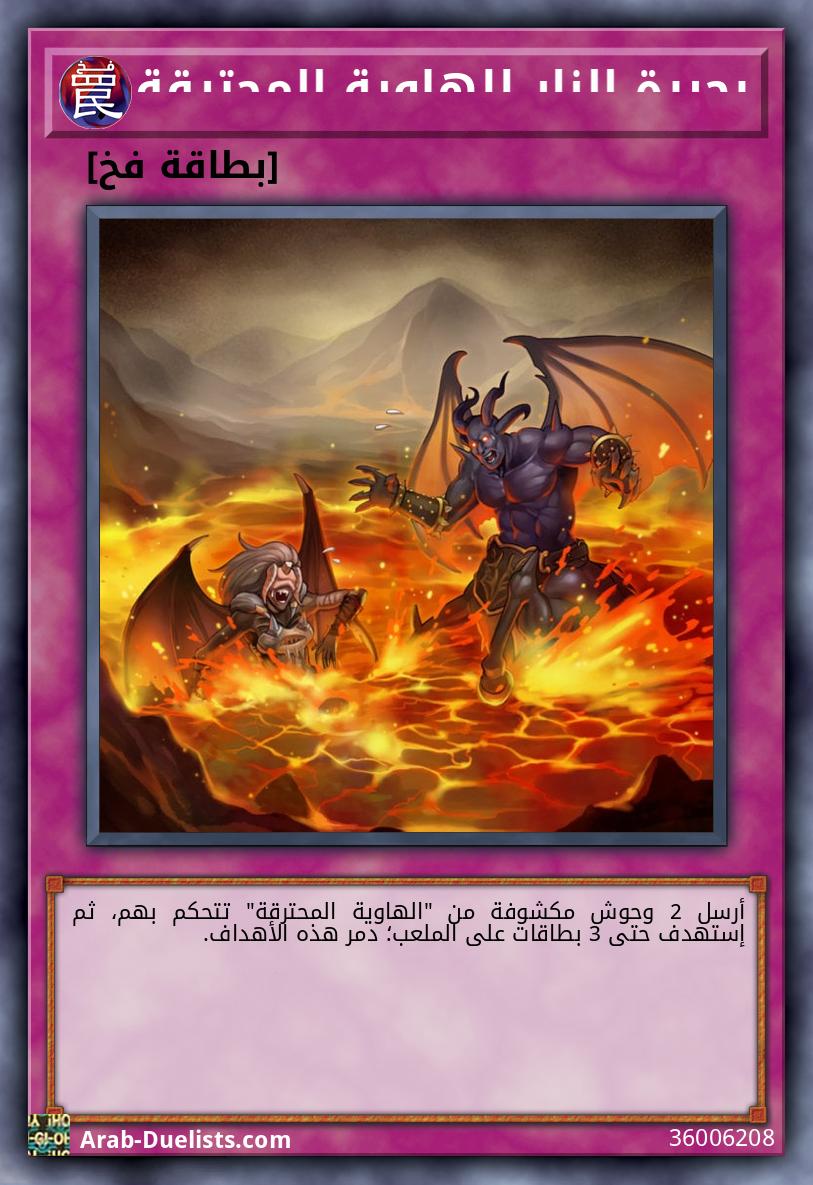 3 وحوش " الهاوية المحترقة " مع أسماء مختلفة يجب إستدعاء دمج لهذه البطاقة ولا يمكنك إستدعاء خاص لها بواسطة طرق أخرى. لا يمكن إستهدفها بواسطة تأثيرات بطاقة الخصم. مرة كل دور، خلال دور كل الاعبين: تستطيع إرسال 1 بطاقة "الهاوية المحترقة" من يدك إلى المقبرة؛ إسحب 1 بطاقة. إذا تم تدمير هذه البطاقة بواسطة معركة أو تأثير بطاقة خصمك، أو تم إرسال هذه البطاقة بينما تتحكم بها إلى المقبرة بواسطة تأثير بطاقة خصمك: تستطيع إرسال 1 بطاقة عشوائية من يد خصمك إلى المقبرة.