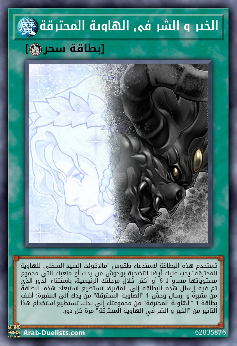 تستخدم هذه البطاقة لاستدعاء طقوس "مالاكولد، السيد السفلي للهاوية المحترقة".يجب عليك أيضا التضحية بوحوش من يدك أو ملعبك التي مجموع مستوياتها مساوٍ لـ 6 أو أكثر. خلال مرحلتك الرئيسية، باستثناء الدور الذي تم فيه إرسال هذه البطاقة إلى المقبرة: تستطيع استبعاد هذه البطاقة من مقبرة و إرسال وحش 1 "الهاوية المحترقة" من يدك إلى المقبرة؛ أضف بطاقة 1 "الهاوية المحترقة" من مجموعتك إلى يدك. تستطيع استخدام هذا التأثير من "الخير و الشر في الهاوية المحترقة" مرة كل دور.