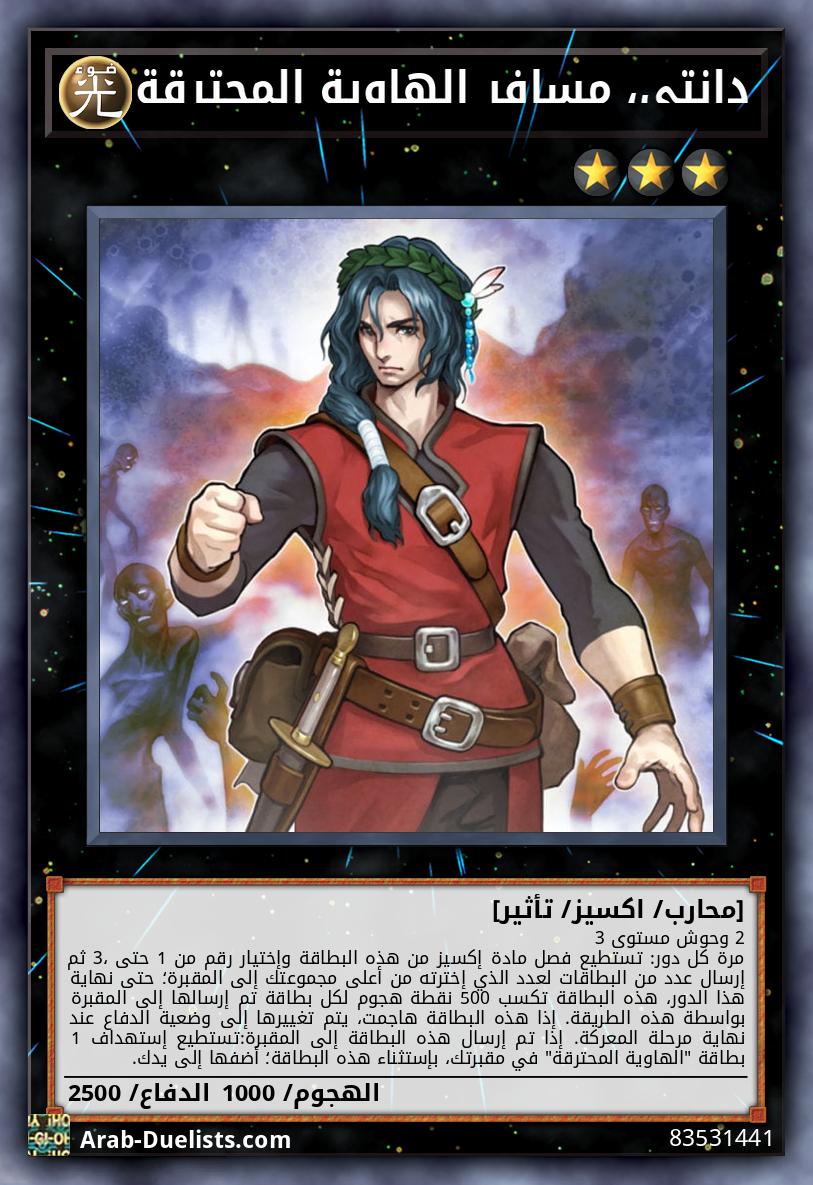وحشان 2 مستوى 6 يمكنك أيضًا استدعاء هذه البطاقة بالإكسيز بإرسال وحش 1 "الهاوية المحترقة" من يدك إلى المقبرة، ثم استخدام وحش "دانتي" 1 تتحكم به كمادة إكسيز. (انقل مواد الإكسيز المرفقة به لهذه البطاقة.) إذا تم استدعاء هذه البطاقة بهذه الطريقة، فالتأثير التالي لا يمكن تفعيله في هذا الدور. مرة كل دور (تأثير سريع): يمكنك فصل مادة إكسيز 1 من هذه البطاقة؛ أرسل بطاقة 1 من مجموعتك إلى المقبرة. إذا تم تدمير هذه البطاقة بسبب بطاقة للخصم (بمعركة أو بتأثير بطاقة) وهي تحت تحكمك و تم إرسالها إلى مقبرتك: يمكنك استدعاء وحش 1 "الهاوية المحترقة" بشكل خاص من مجموعتك الإضافية، متجاهلًا شروط استدعائه.