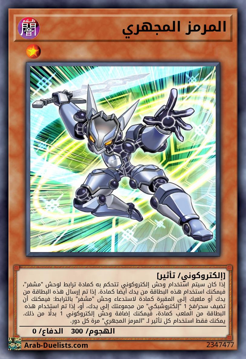 إذا سيتم استتخدَام وحش إلكتروكوني تتحكم به كمادة ترابط لوحش "مشفر"، يمكن استخدام هذه البطاقة في يدك أيضا كمادة. إذا تم إرسال هذه البطاقة من يدك أو الملعب إلى المقبرة كمادة لاستدعاء وحش "مشفر" بالترابط: يمكنك استهداف وحش 1 مكشوف يتحكم به خصمك؛ غيّر نقاط هجومه إلى 0، أو، إذا تم استخدام هذه البطاقة في الملعب كمادة، يمكنك استهداف وحشين 2، بدلا من ذلك. يمكنك فقط استخدام كل تأثير لـ"المرمز المُشّع" مرة كل دور.
