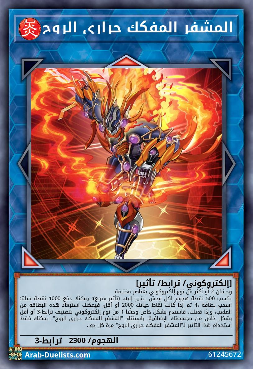 وحشان 2 أو أكثر من نوع إلكتروكوني بعناصر مختلفة يكسب 500 نقطة هجوم لكل وحش يشير إليه. (تأثير سريع): يمكنك دفع 1000 نقطة حياة؛ اسحب بطاقة 1، ثم إذا كانت نقاط حياتك 2000 أو أقل، فيمكنك استبعاد هذه البطاقة من الملعب، وإذا فعلت، فاستدعِ بشكل خاص وحشًا 1 من نوع إلكتروكوني بتصنيف ترابط-3 أو أقل بشكل خاص من مجموعتك الإضافية، باستثناء "المشفر المفكك حراري الروح". يمكنك فقط استخدام هذا التأثير لـ"المشفر المفكك حراري الروح" مرة كل دور.
