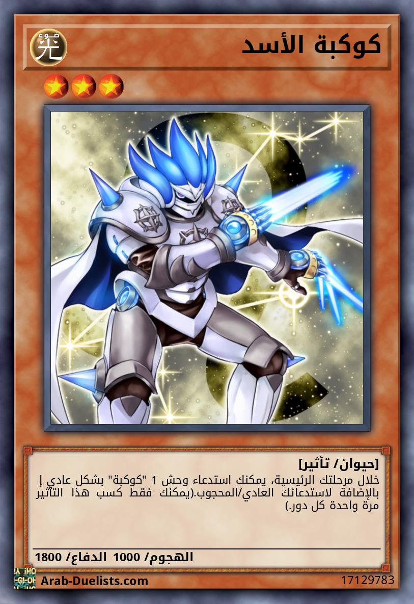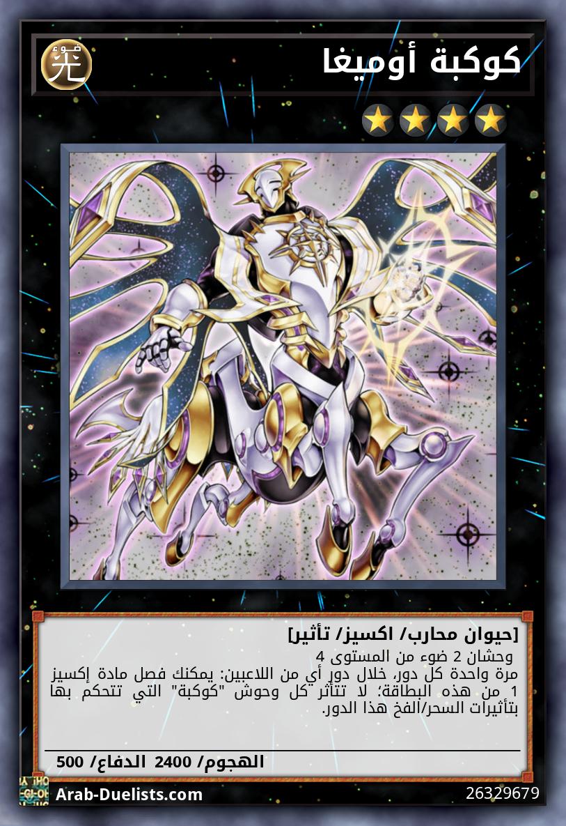 3 وحوش أو أكثر من المستوى 4 (1) لا يمكن لخصمك استهداف وحوش الإكسيز "كوكبة" أو "الفارس النجمي" من الرتبة 5 أو أعلى التي تتحكم بهم بتأثيرات البطاقات. (2) مرة كل دور: يمكنك فصل مادة 1 من هذه البطاقة؛ أضف وحشًا 1 "كوكبة" أو "الفارس النجمي" من مجموعتك إلى يدك، ثم فورًا بعد تنفيذ هذا التأثير، يمكنك استدعاء وحش ضوء 1 بشكل عادي. (3) إذا تم إرسال هذه البطاقة إلى المقبرة، إلا من الملعب: فيمكنك الاستدعاء بشكل خاص وحش 1 "كوكبة" أو "الفارس النجمي" مستبعد لك أو من يدك.