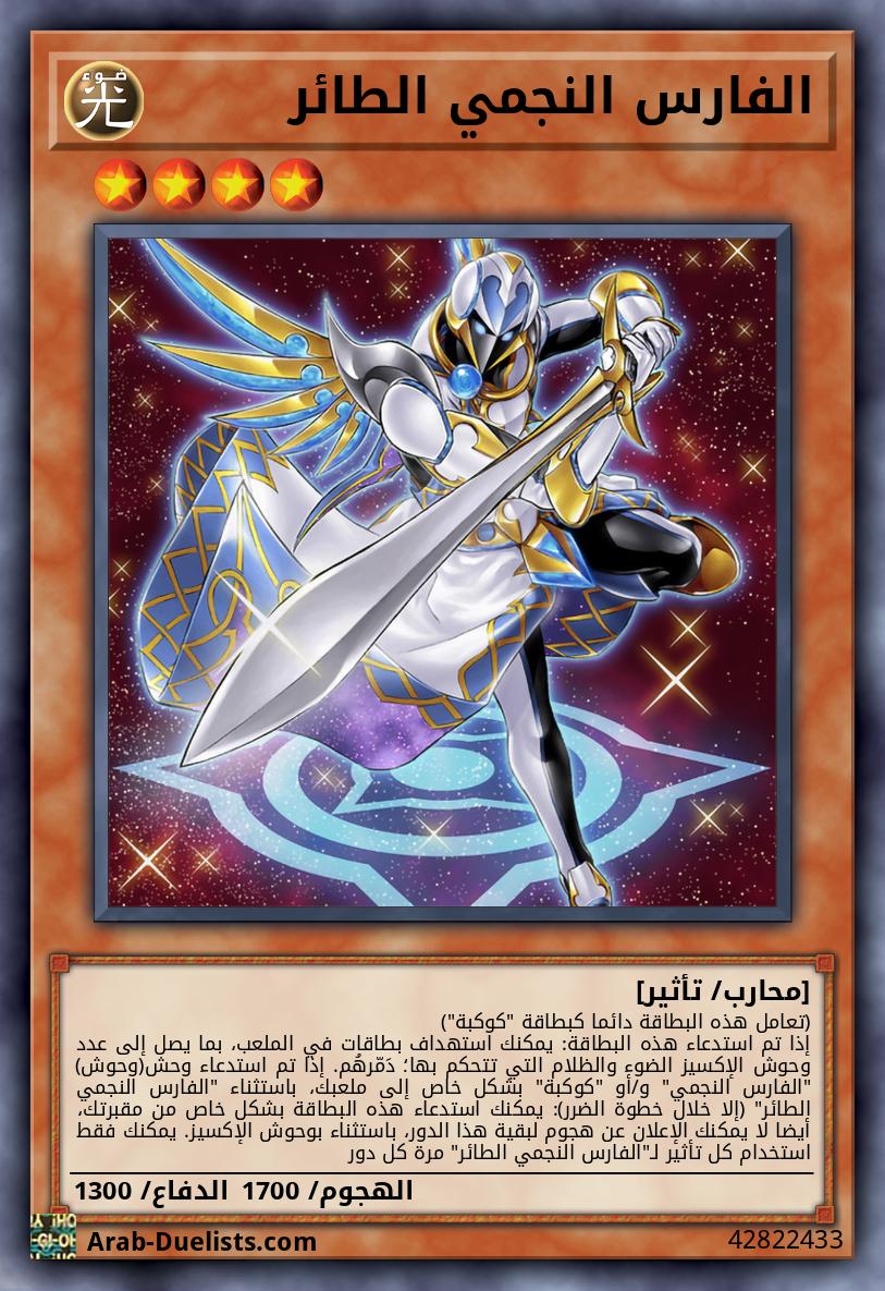 (تعامل هذه البطاقة دائما كبطاقة "كوكبة") إذا تم استدعاء هذه البطاقة: يمكنك استهداف بطاقات في الملعب، بما يصل إلى عدد وحوش الإكسيز الضوء والظلام التي تتحكم بها؛ دَمّرهُم. إذا تم استدعاء وحش(وحوش) "الفارس النجمي" و/أو "كوكبة" بشكل خاص إلى ملعبك، باستثناء "الفارس النجمي الطائر" (إلا خلال خطوة الضرر): يمكنك استدعاء هذه البطاقة بشكل خاص من مقبرتك، أيضا لا يمكنك الإعلان عن هجوم لبقية هذا الدور، باستثناء بوحوش الإكسيز. يمكنك فقط استخدام كل تأثير لـ"الفارس النجمي الطائر" مرة كل دور