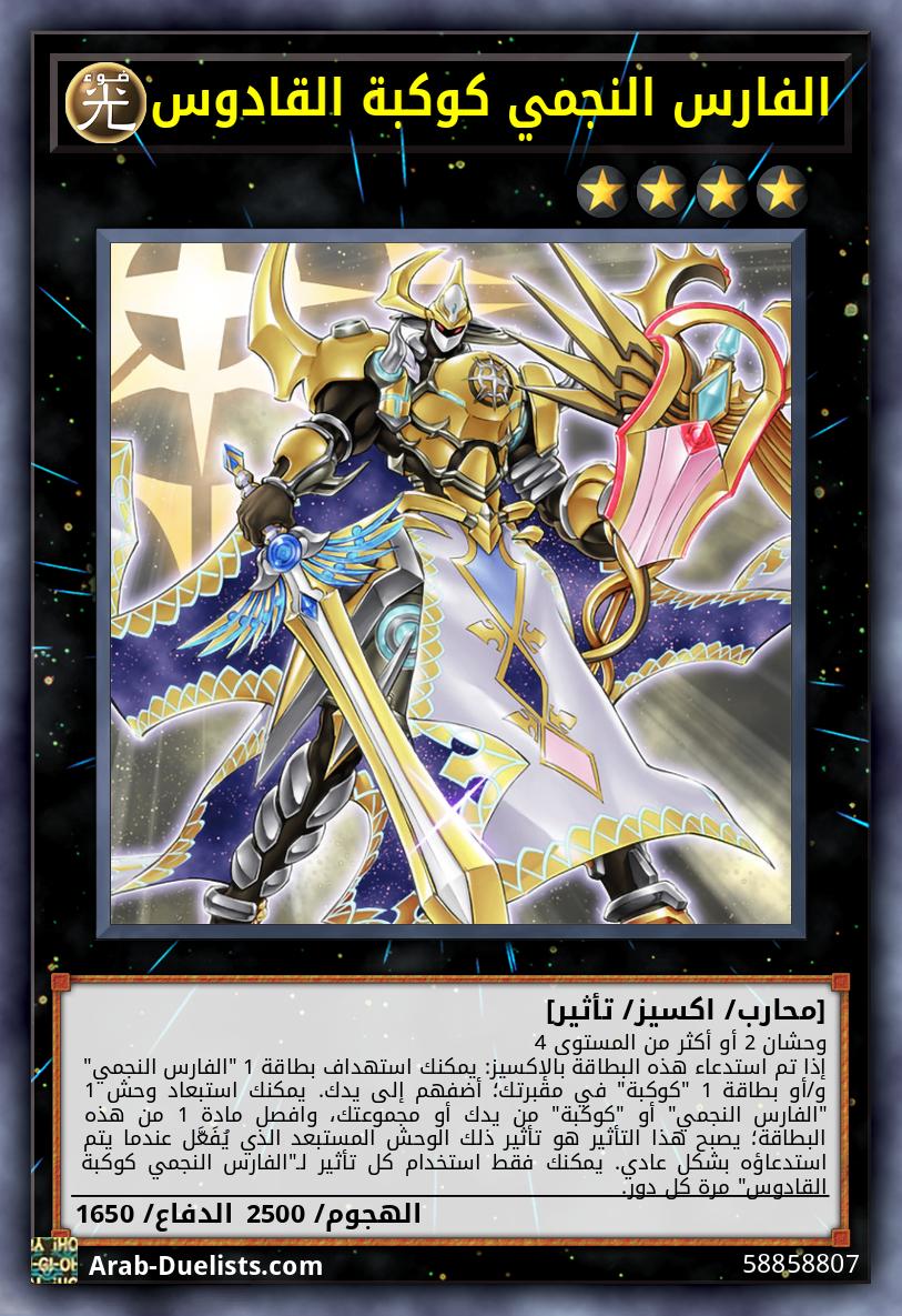 وحشان 2 أو أكثر من المستوى 4 إذا تم استدعاء هذه البطاقة بالإكسيز: يمكنك استهداف بطاقة 1 "الفارس النجمي" و/أو بطاقة 1 "كوكبة" في مقبرتك؛ أضفهم إلى يدك. يمكنك استبعاد وحش 1 "الفارس النجمي" أو "كوكبة" من يدك أو مجموعتك، وافصل مادة 1 من هذه البطاقة؛ يصبح هذا التأثير هو تأثير ذلك الوحش المستبعد الذي يُفَعَّل عندما يتم استدعاؤه بشكل عادي. يمكنك فقط استخدام كل تأثير لـ"الفارس النجمي كوكبة القادوس" مرة كل دور.
