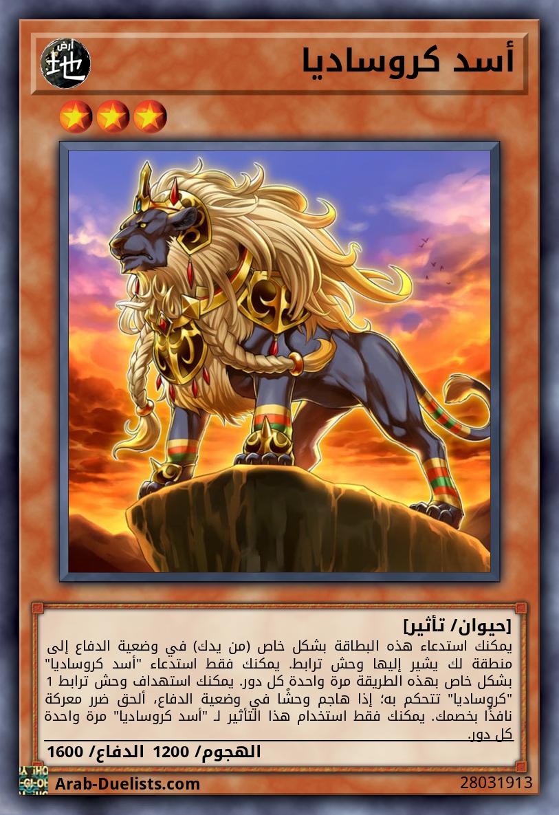 يمكنك استدعاء هذه البطاقة بشكل خاص (من يدك) في وضعية الدفاع إلى منطقة لك يشير إليها وحش ترابط. يمكنك فقط استدعاء "أسد كروساديا" بشكل خاص بهذه الطريقة مرة واحدة كل دور. يمكنك استهداف وحش ترابط 1 "كروساديا" تتحكم به؛ إذا هاجم وحشًا في وضعية الدفاع، ألحق ضرر معركة نافذًا بخصمك. يمكنك فقط استخدام هذا التأثير لـ "أسد كروساديا" مرة واحدة كل دور.