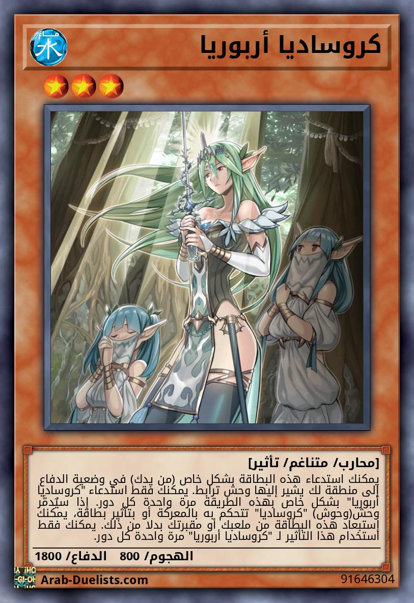 يمكنك استدعاء هذه البطاقة بشكل خاص (من يدك) في وضعية الدفاع إلى منطقة لك يشير إليها وحش ترابط. يمكنك فقط استدعاء "كروساديا أربوريا" بشكل خاص بهذه الطريقة مرة واحدة كل دور. إذا سيٌدمَّر وحش(وحوش) "كروساديا" تتحكم به بالمعركة أو بتأثير بطاقة، يمكنك إستبعاد هذه البطاقة من ملعبك أو مقبرتك بدلا من ذلك. يمكنك فقط استخدام هذا التأثير لـ "كروساديا أربوريا" مرة واحدة كل دور.