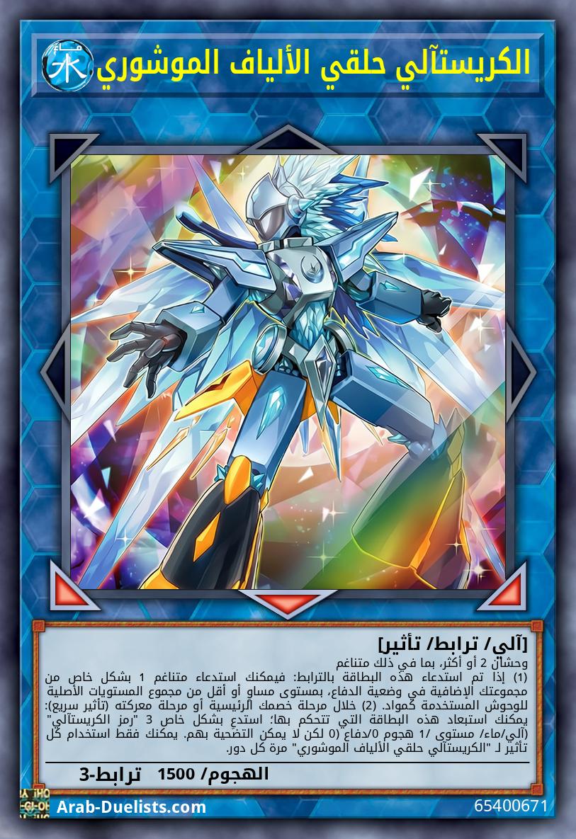 وحشان 2 أو أكثر، بما في ذلك متناغم (1) إذا تم استدعاء هذه البطاقة بالترابط: فيمكنك استدعاء متناغم 1 بشكل خاص من مجموعتك الإضافية في وضعية الدفاع، بمستوى مساوٍ أو أقل من مجموع المستويات الأصلية للوحوش المستخدمة كمواد. (2) خلال مرحلة خصمك الرئيسية أو مرحلة معركته (تأثير سريع): يمكنك استبعاد هذه البطاقة التي تتحكم بها؛ استدعِ بشكل خاص 3 "رمز الكريستآلي" (آلي/ماء/ مستوى 1/ هجوم 0/دفاع 0) لكن لا يمكن التضحية بهم. يمكنك فقط استخدام كل تأثير لـ "الكريستآلي حلقي الألياف الموشوري" مرة كل دور.