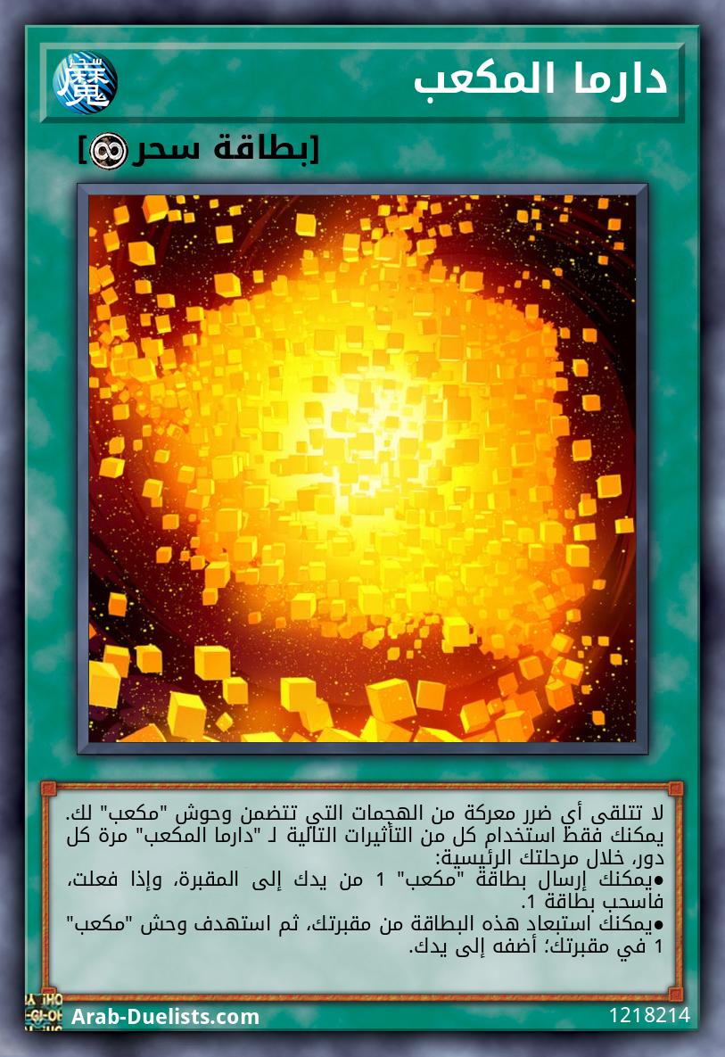 لا تتلقى أي ضرر معركة من الهجمات التي تتضمن وحوش "مكعب" لك. يمكنك فقط استخدام كل من التأثيرات التالية لـ "دارما المكعب" مرة كل دور، خلال مرحلتك الرئيسية: ●يمكنك إرسال بطاقة "مكعب" 1 من يدك إلى المقبرة، وإذا فعلت، فاسحب بطاقة 1. ●يمكنك استبعاد هذه البطاقة من مقبرتك، ثم استهدف وحش "مكعب" 1 في مقبرتك؛ أضفه إلى يدك.