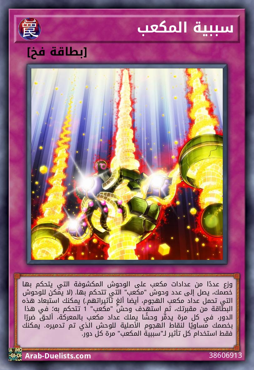 وزع عددًا من عدادات مكعب على الوحوش المكشوفة التي يتحكم بها خصمك، يصل إلى عدد وحوش "مكعب" التي تتحكم بها. (لا يمكن للوحوش التي تحمل عداد مكعب الهجوم، أيضا ألغِ تأثيراتهم.) يمكنك استبعاد هذه البطاقة من مقبرتك، ثم استهدف وحش "مكعب" 1 تتحكم به؛ في هذا الدور، في كل مرة يدمِّر وحشًا يملك عداد مكعب بالمعركة، ألحق ضررًا بخصمك مساويًا لنقاط الهجوم الأصلية للوحش الذي تم تدميره. يمكنك فقط استخدام كل تأثير لـ"سببية المكعب" مرة كل دور.