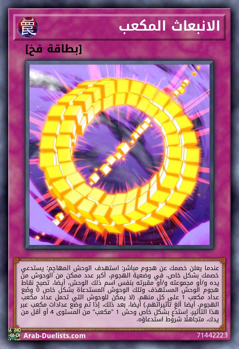 عندما يعلن خصمك عن هجوم مباشر: استهدف الوحش المهاجِم؛ يستدعي خصمك بشكل خاص، في وضعية الهجوم، أكبر عدد ممكن من الوحوش من يده و/أو مجموعته و/أو مقبرته بنفس اسم ذلك الوحش، أيضا، تصبح نقاط هجوم الوحش المستهدَف وتلك الوحوش المستدعاة بشكل خاص 0 وضَع عداد مكعب 1 على كل منهم. (لا يمكن للوحوش التي تحمل عداد مكعب الهجوم، أيضا ألغِ تأثيراتهم.) أيضا، بعد ذلك، إذا تم وضع عدادات مكعب عبر هذا التأثير، استدعِ بشكل خاص وحش 1 "مكعب" من المستوى 4 أو أقل من يدك، متجاهلًا شروط استدعاؤه.