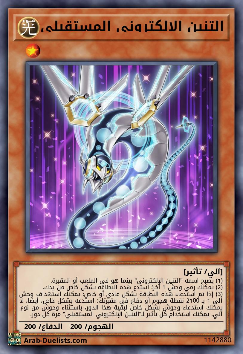 (1) يصبح اسمه "التنين الإلكتروني" بينما هو في الملعب أو المقبرة. (2) يمكنك رمي وحش 1 آخر؛ استدع هذه البطاقة بشكل خاص من يدك. (3) إذا تم استدعاء هذه البطاقة بشكل عادي أو خاص: يمكنك استهداف وحش آلي 1 بـ 2100 نقطة هجوم أو دفاع في مقبرتك؛ استدعه بشكل خاص، أيضا، لا يمكنك استدعاء وحوش بشكل خاص لبقية هذا الدور، باستثناء وحوش من نوع آلي. يمكنك استخدام كل تأثير لـ"التنين الإلكتروني المستقبلي" مرة كل دور.