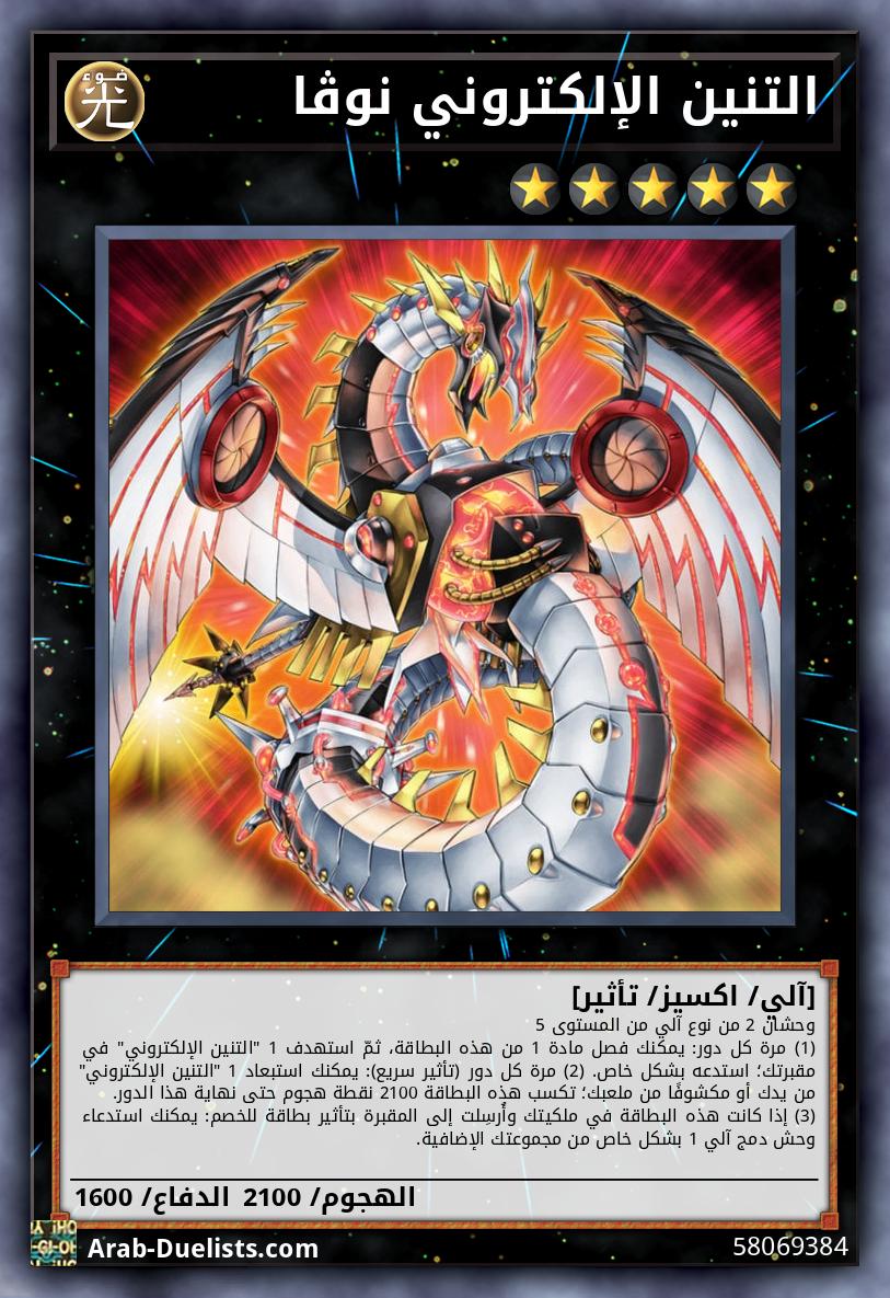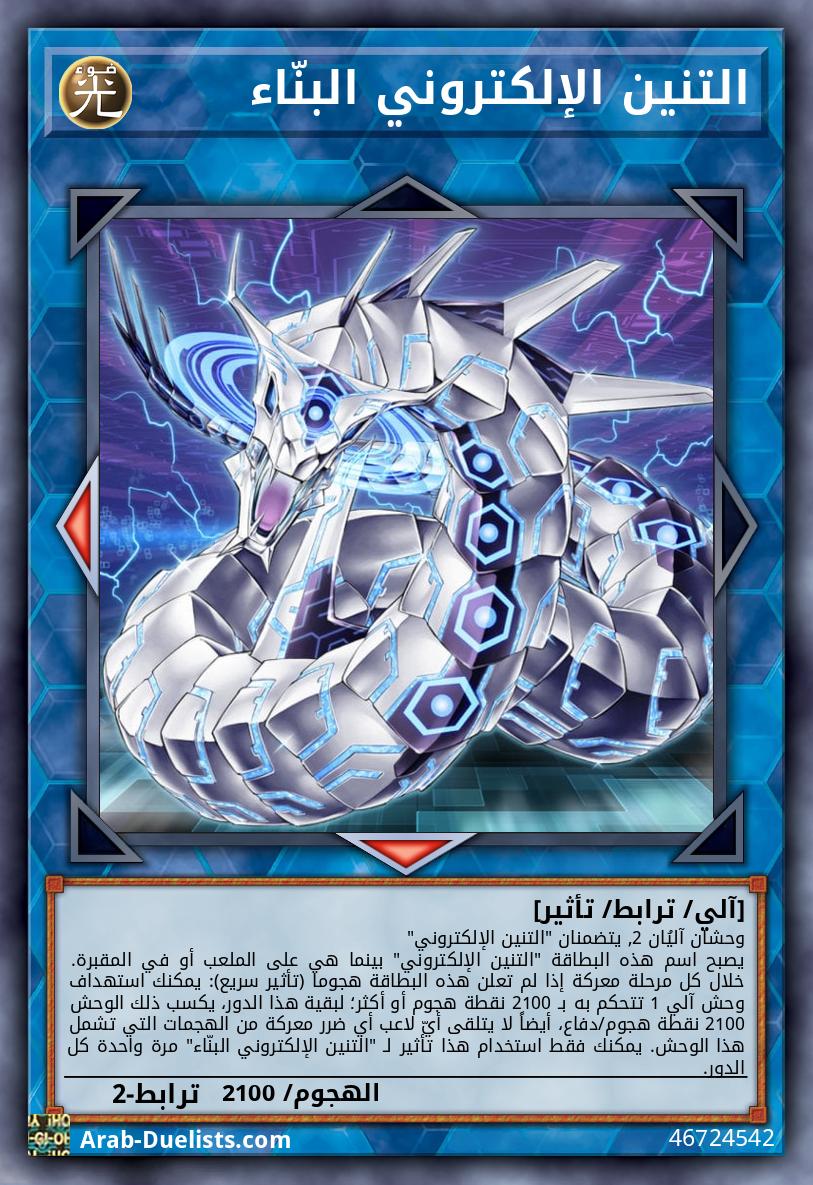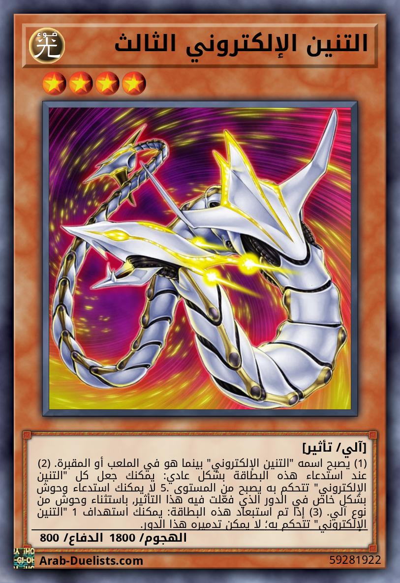 (1) يصبح اسمه "التنين الإلكتروني" بينما هو في الملعب أو المقبرة. (2) عند استدعاء هذه البطاقة بشكل عادي: يمكنك جعل كل "التنين الإلكتروني" تتحكم به يصبح من المستوى 5. لا يمكنك استدعاء وحوش بشكل خاص في الدور الذي فعّلت فيه هذا التأثير, باستثناء وحوش من نوع آلي. (3) إذا تم استبعاد هذه البطاقة: يمكنك استهداف 1 "التنين الإلكتروني" تتحكم به؛ لا يمكن تدميره هذا الدور.