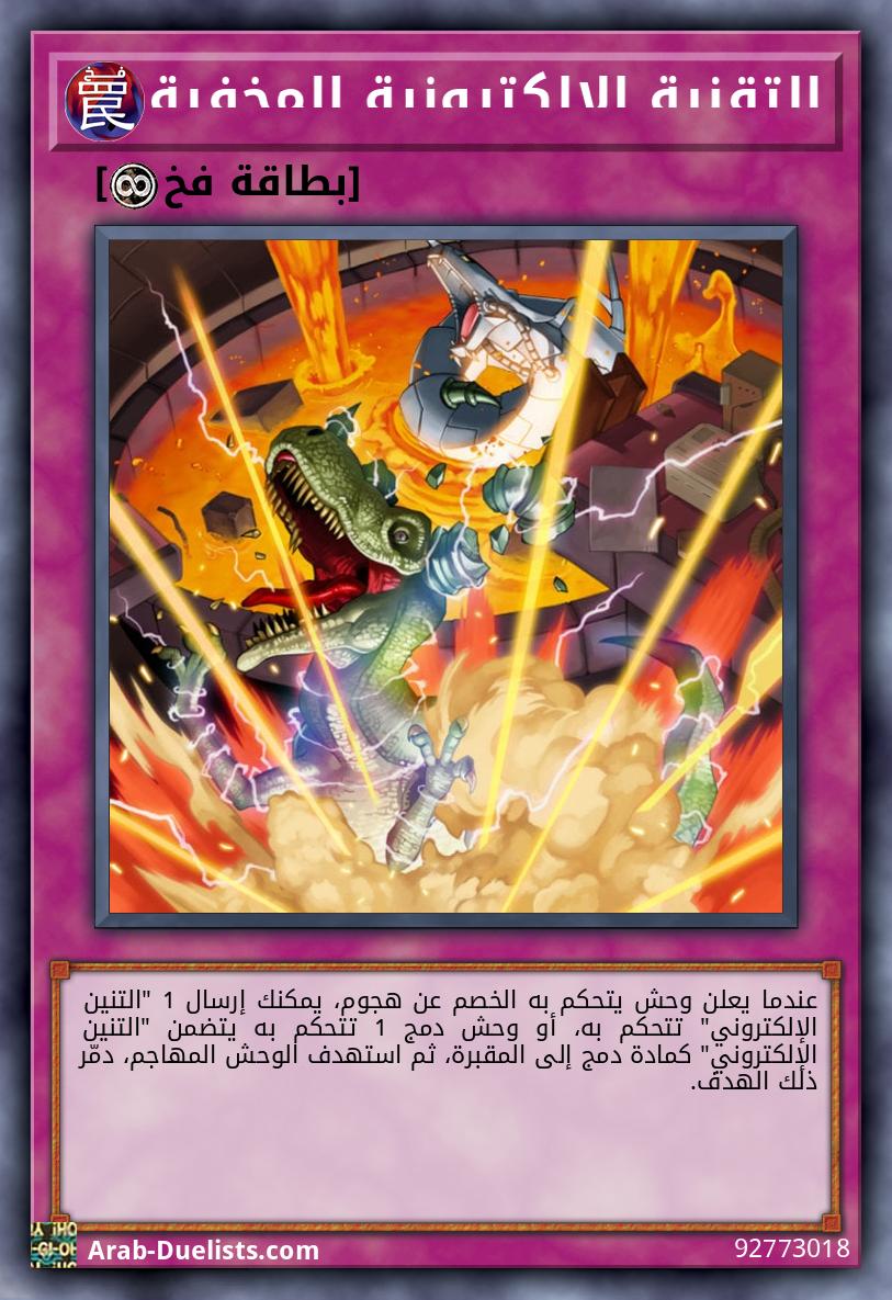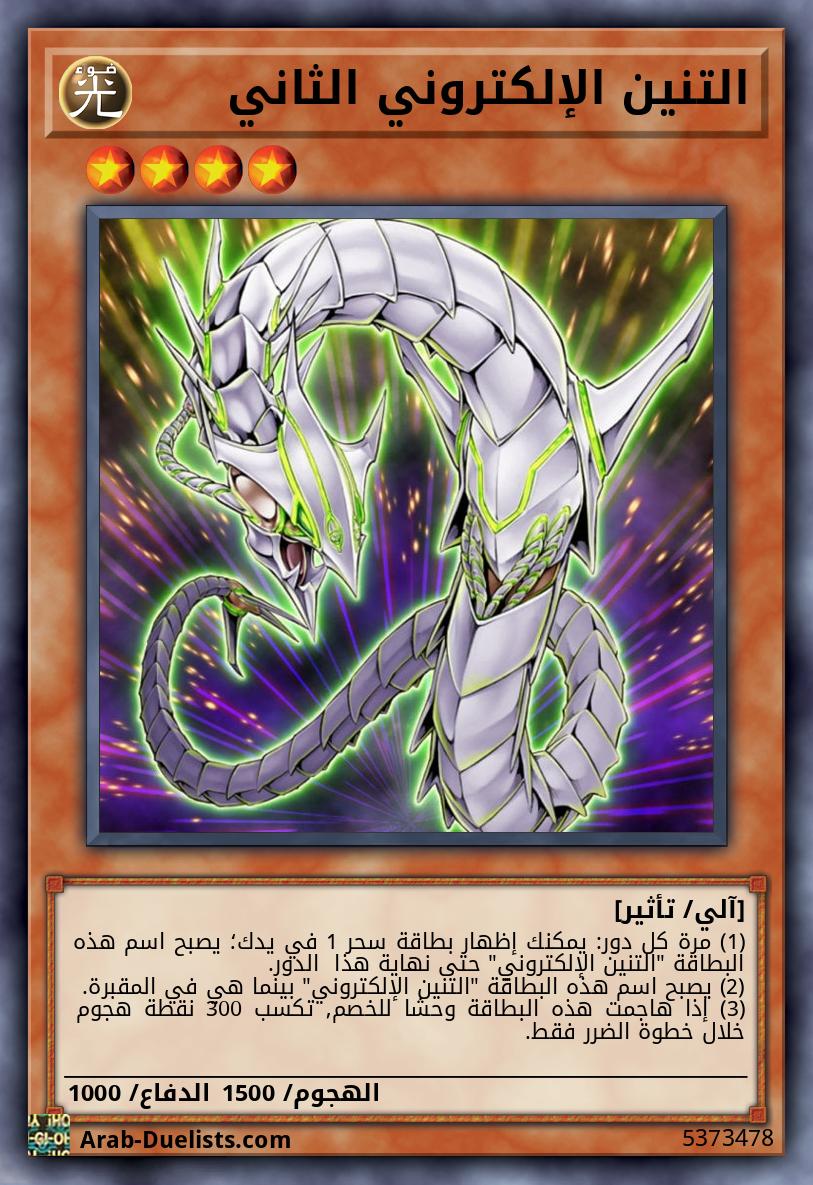(1) مرة كل دور: يمكنك إظهار بطاقة سحر 1 في يدك؛ يصبح اسم هذه البطاقة "التنين الإلكتروني" حتى نهاية هذا الدور. (2) يصبح اسم هذه البطاقة "التنين الإلكتروني" بينما هي في المقبرة. (3) إذا هاجمت هذه البطاقة وحشا للخصم, تكسب 300 نقطة هجوم خلال خطوة الضرر فقط.