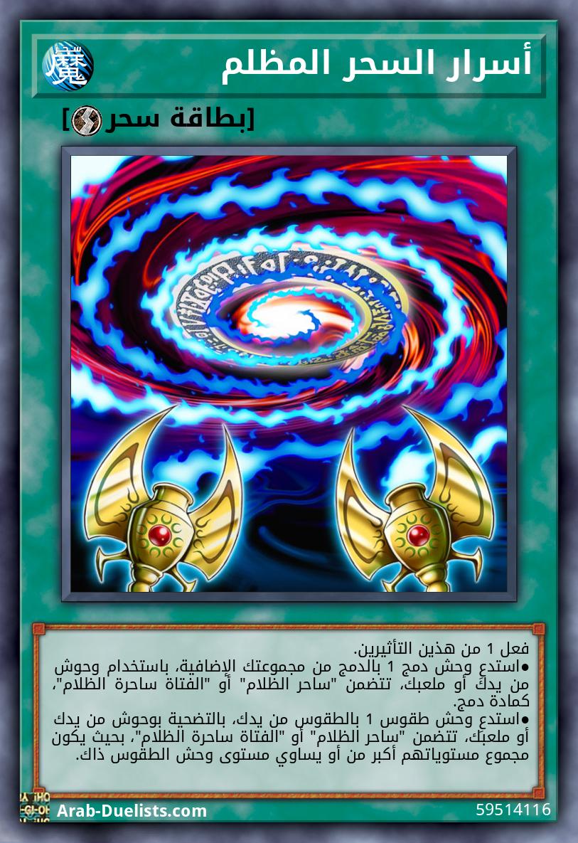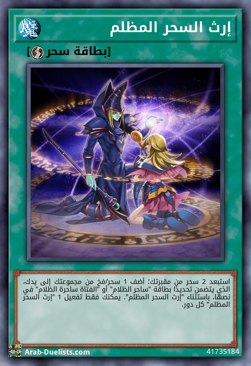 استبعد 2 سحر من مقبرتك؛ أضف 1 سحر/فخ من مجموعتك إلى يدك، الذي يتضمن تحديدًا بطاقة "ساحر الظلام" أو "الفتاة ساحرة الظلام" في نصها، باستثناء "إرث السحر المظلم". يمكنك فقط تفعيل 1 "إرث السحر المظلم" كل دور.