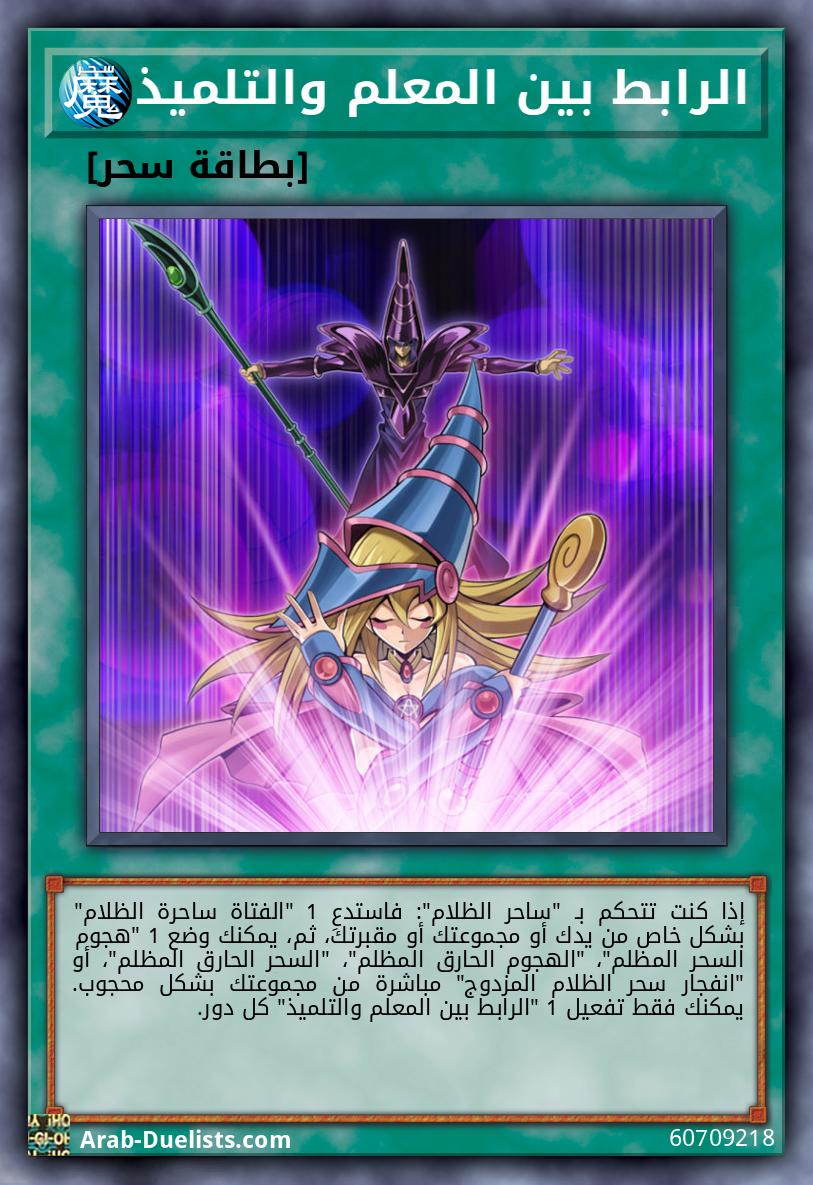 إذا كنت تتحكم بـ "ساحر الظلام": فاستدعِ 1 "الفتاة ساحرة الظلام" بشكل خاص من يدك أو مجموعتك أو مقبرتك، ثم، يمكنك وضع 1 "هجوم السحر المظلم"، "الهجوم الحارق المظلم"، "السحر الحارق المظلم"، أو "انفجار سحر الظلام المزدوج" مباشرة من مجموعتك بشكل محجوب. يمكنك فقط تفعيل 1 "الرابط بين المعلم والتلميذ" كل دور.