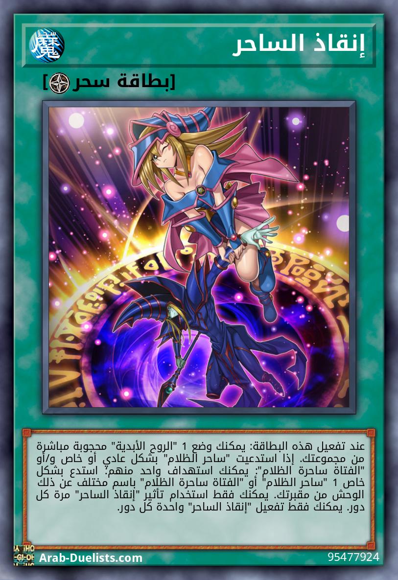 عند تفعيل هذه البطاقة: يمكنك وضع 1 "الروح الأبدية" محجوبة مباشرة من مجموعتك. إذا استدعيت "ساحر الظلام" بشكل عادي أو خاص و/أو "الفتاة ساحرة الظلام": يمكنك استهداف واحد منهم؛ استدع بشكل خاص 1 "ساحر الظلام" أو "الفتاة ساحرة الظلام" باسم مختلف عن ذلك الوحش من مقبرتك. يمكنك فقط استخدام تأثير "إنقاذ الساحر" مرة كل دور. يمكنك فقط تفعيل "إنقاذ الساحر" واحدة كل دور.